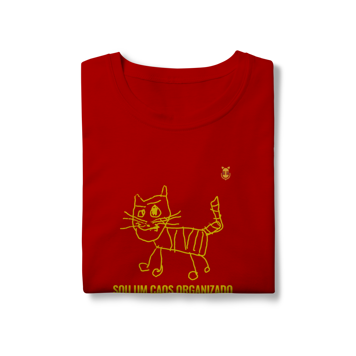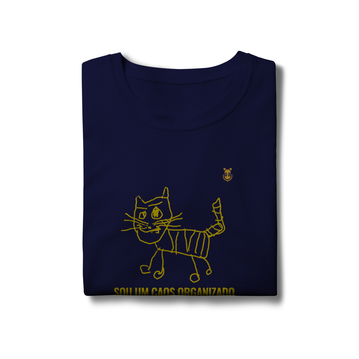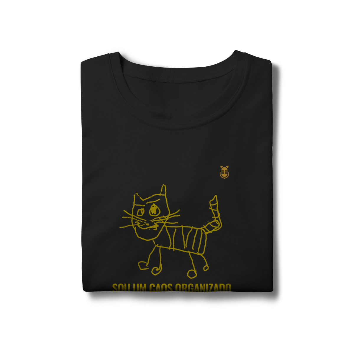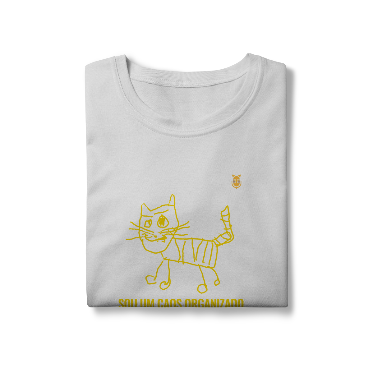 A  Caos Organizado – Edição Rabisco Felino traz um gato desenhado no estilo infantil, cheio de linhas tortas e personalidade — acompanhado da frase que define muita gente: “Sou um caos organizado”.