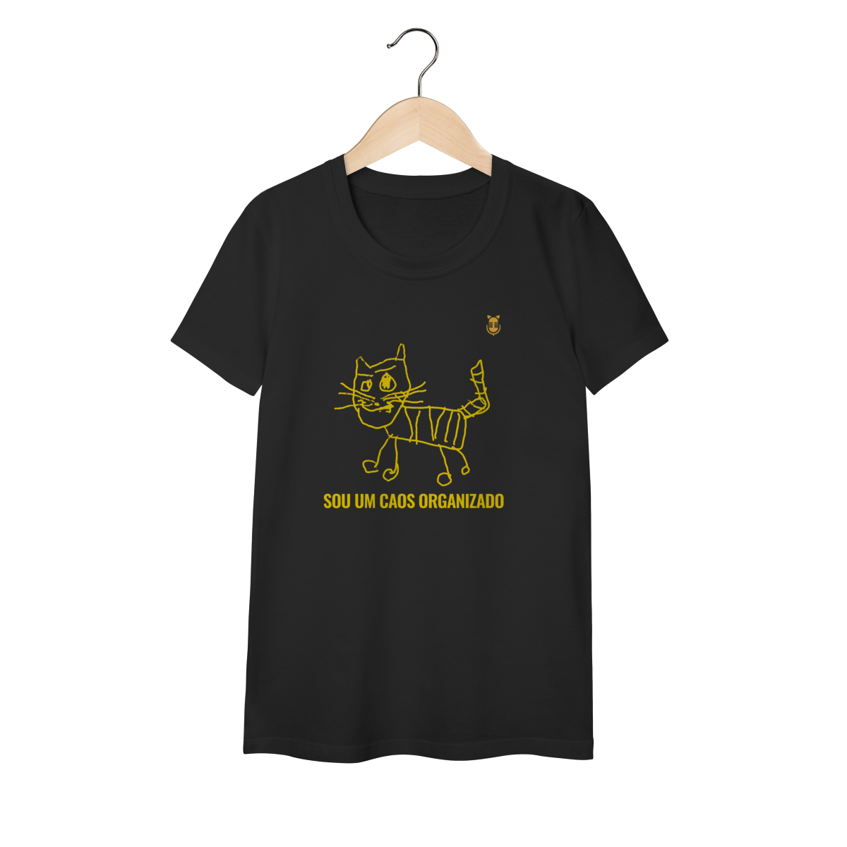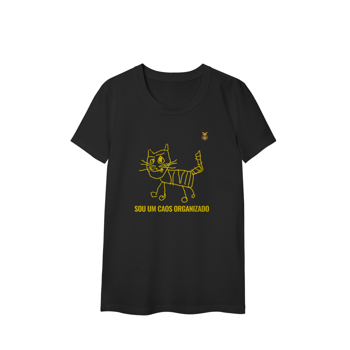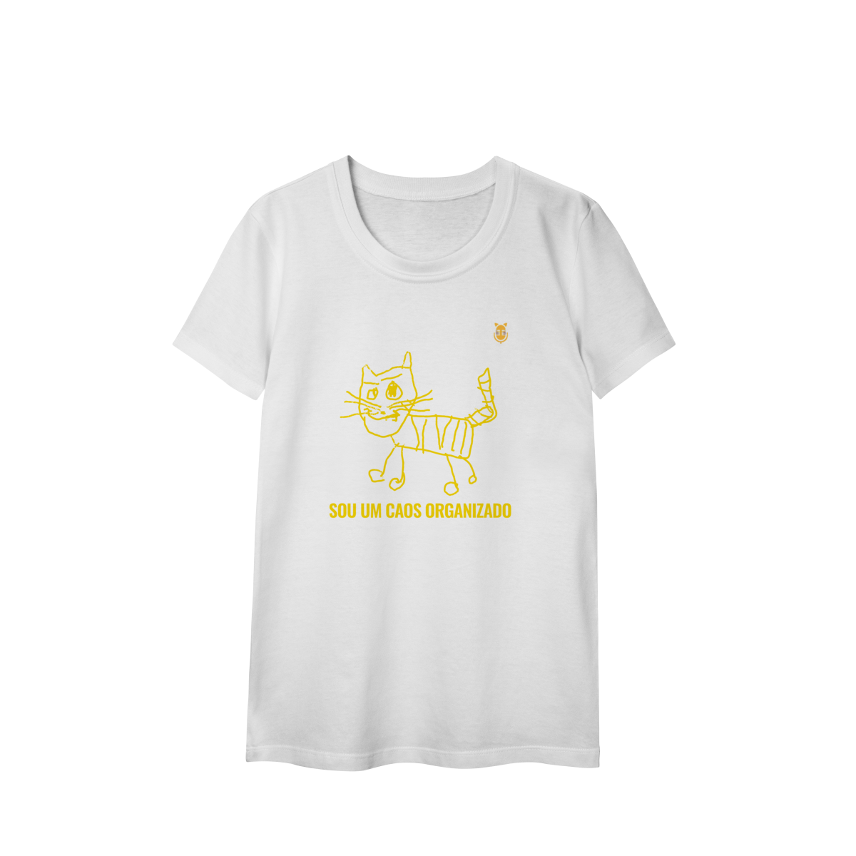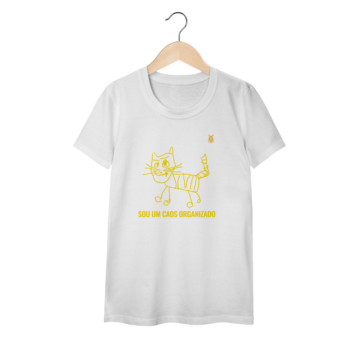 A  Caos Organizado – Edição Rabisco Felino traz um gato desenhado no estilo infantil, cheio de linhas tortas e personalidade — acompanhado da frase que define muita gente: “Sou um caos organizado”.