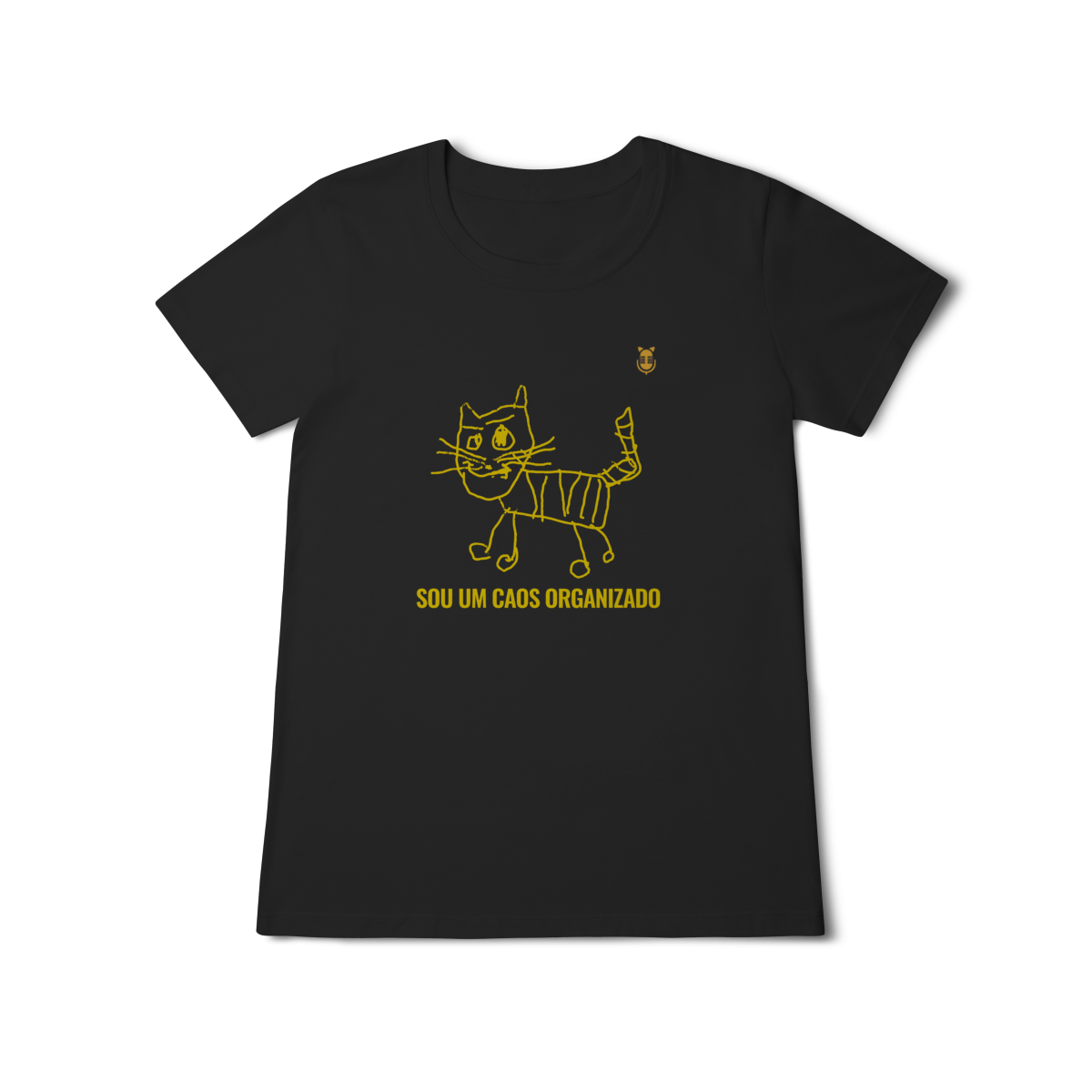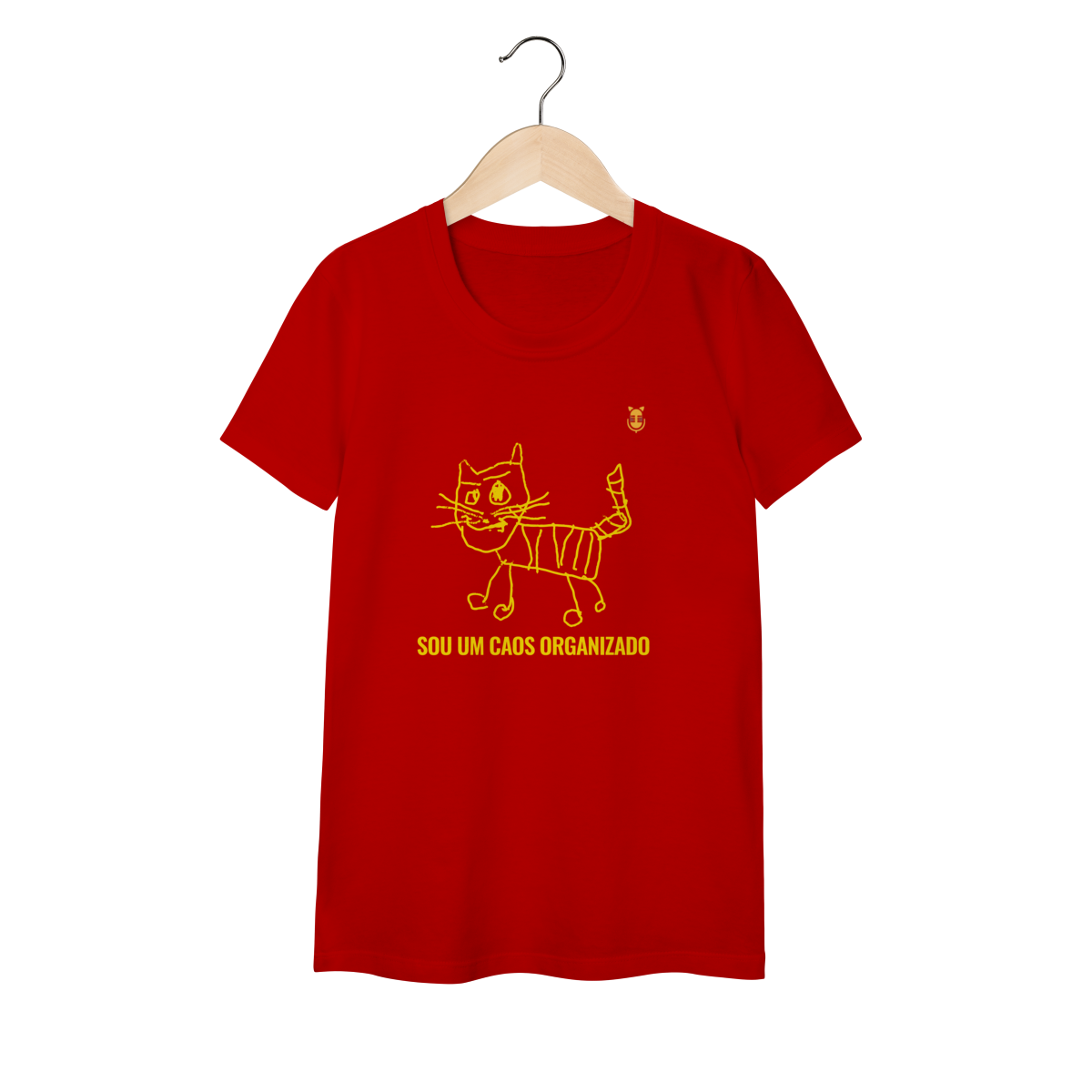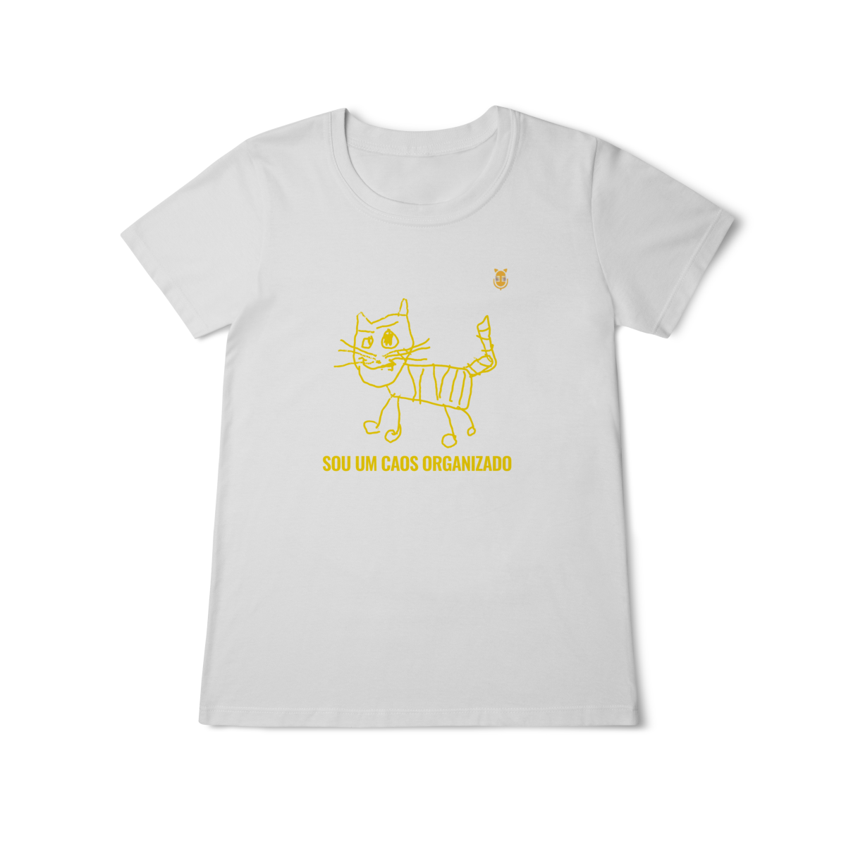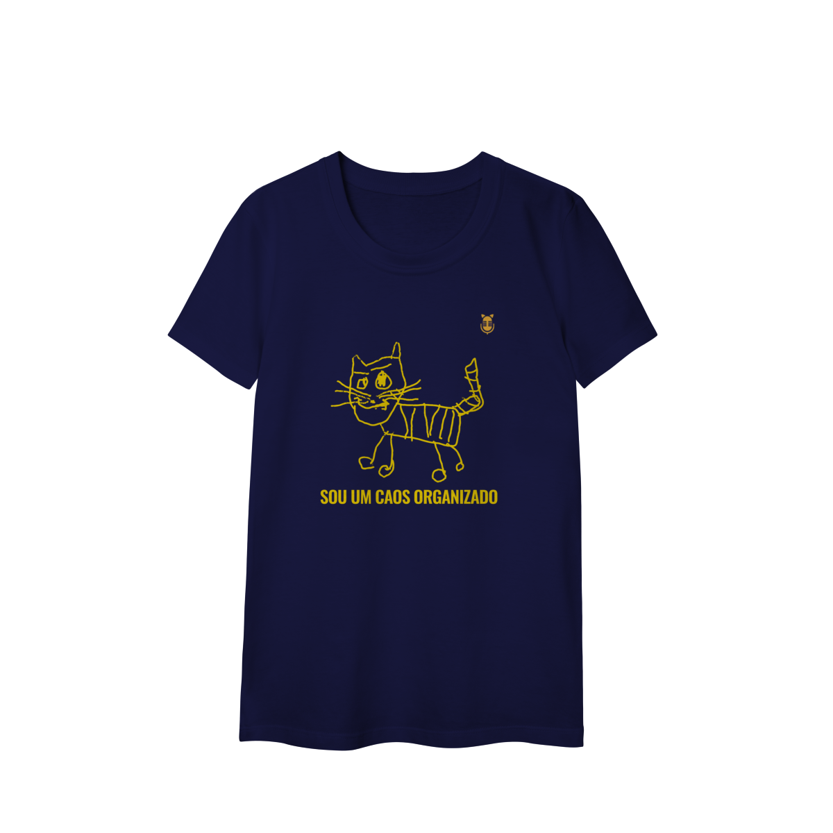 A  Caos Organizado – Edição Rabisco Felino traz um gato desenhado no estilo infantil, cheio de linhas tortas e personalidade — acompanhado da frase que define muita gente: “Sou um caos organizado”.