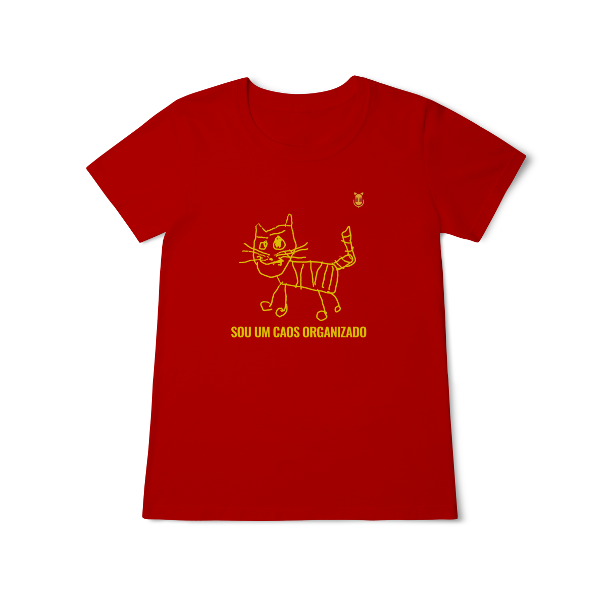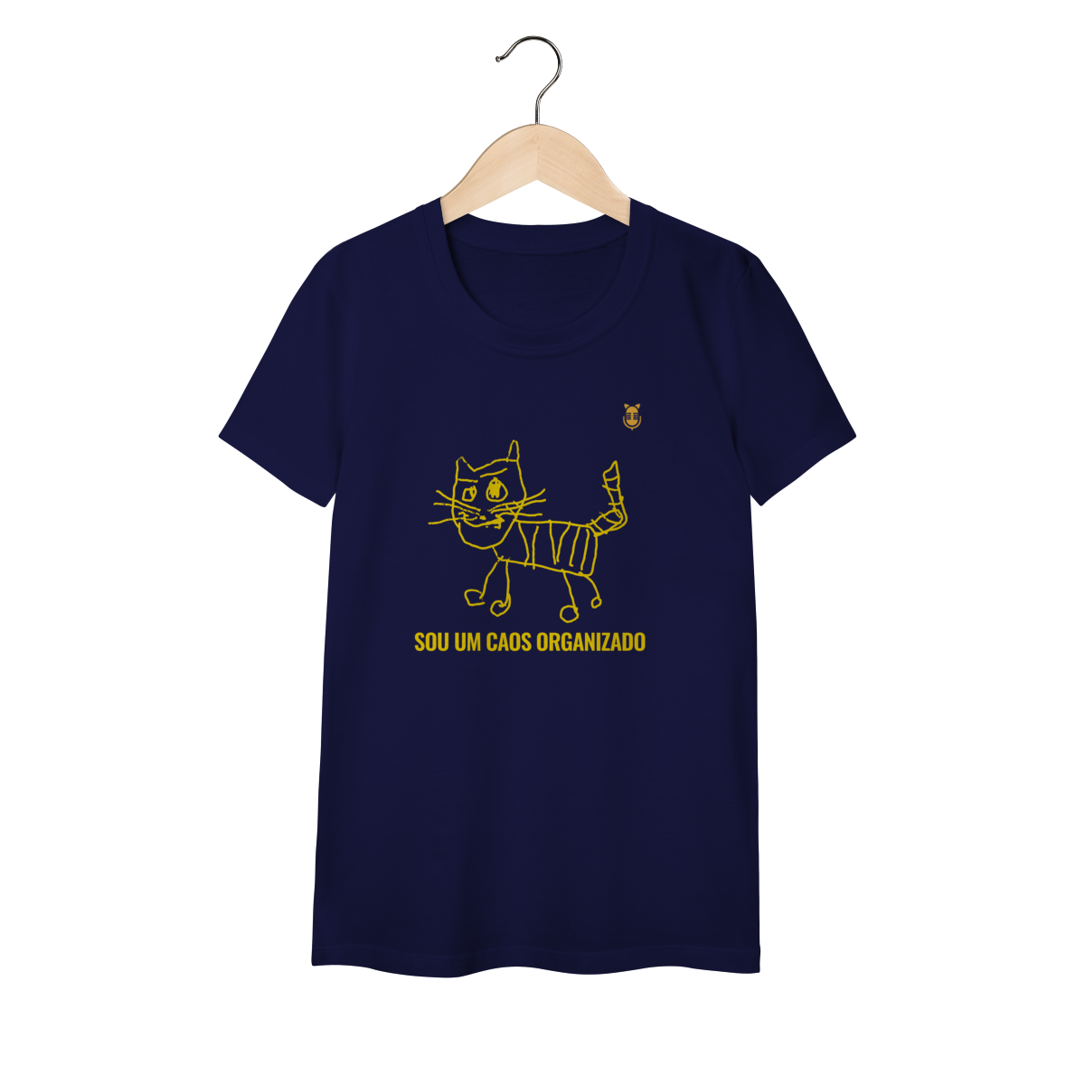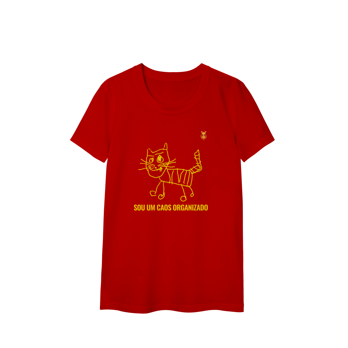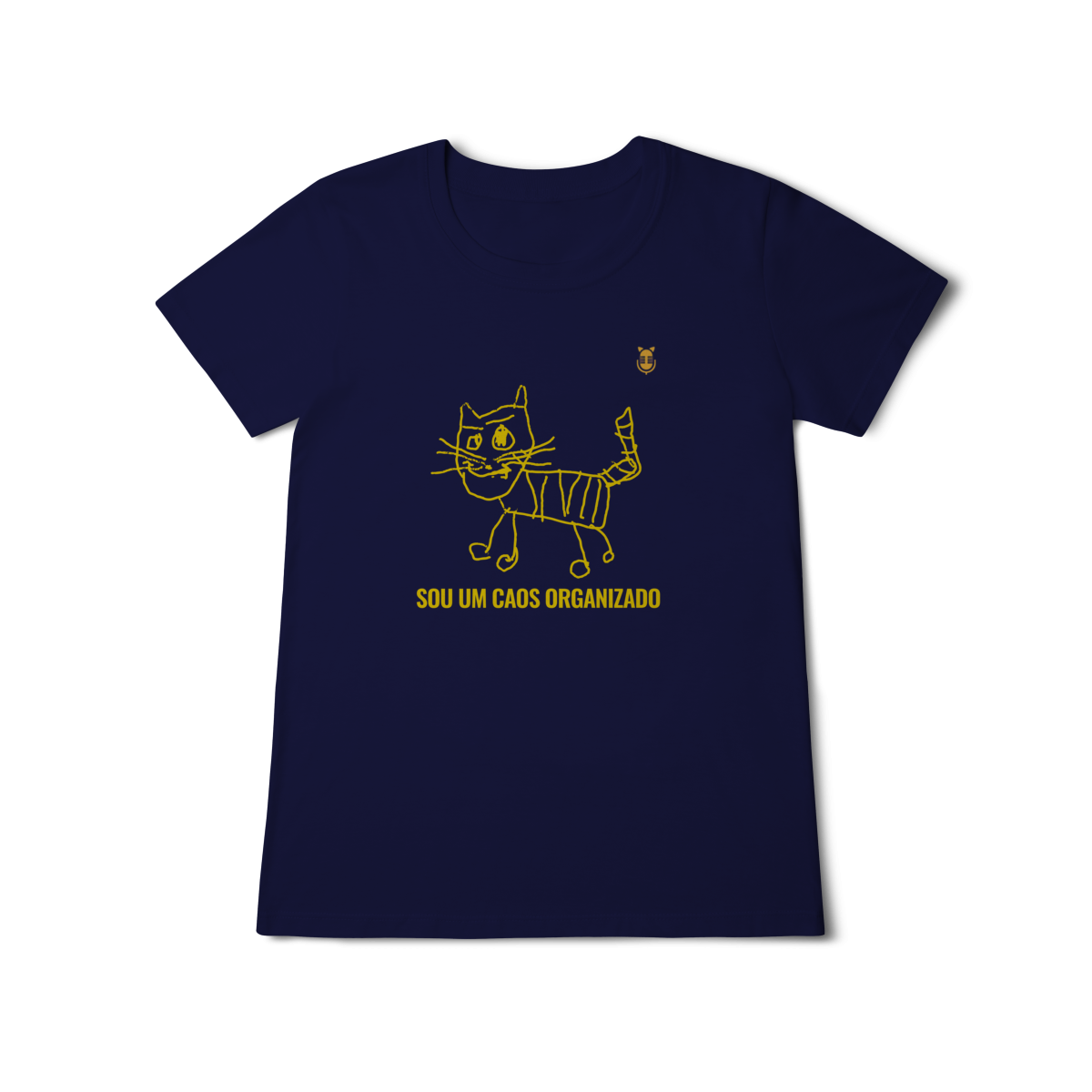 A  Caos Organizado – Edição Rabisco Felino traz um gato desenhado no estilo infantil, cheio de linhas tortas e personalidade — acompanhado da frase que define muita gente: “Sou um caos organizado”.