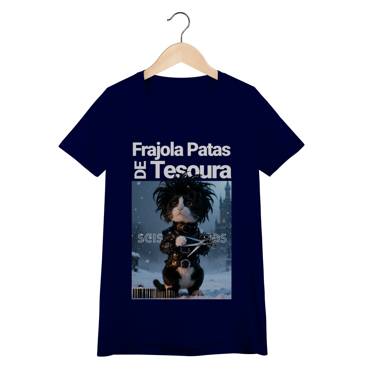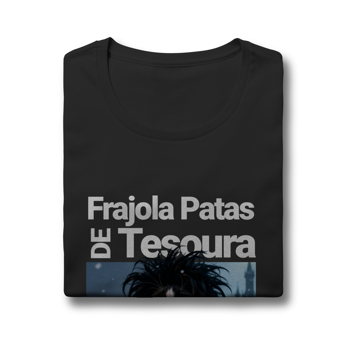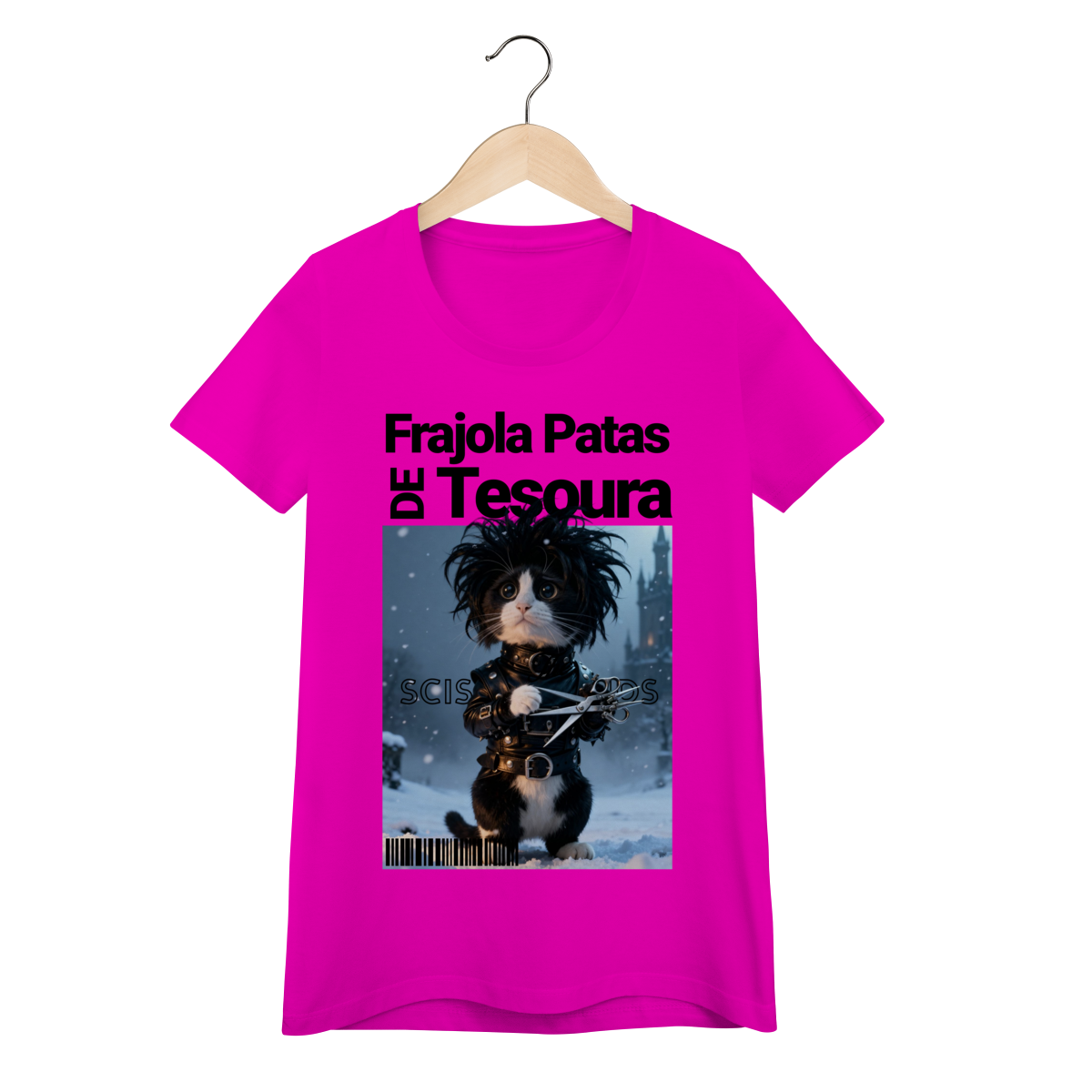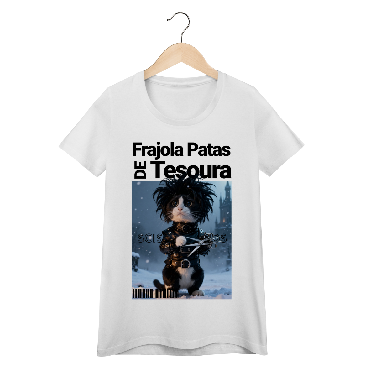 A camiseta “Frajola Patas de Tesoura” traz uma releitura divertida e estilizada do clássico personagem de tesouras — só que agora reinventado como um gatinho dramático, fofo e cheio de personalidade.