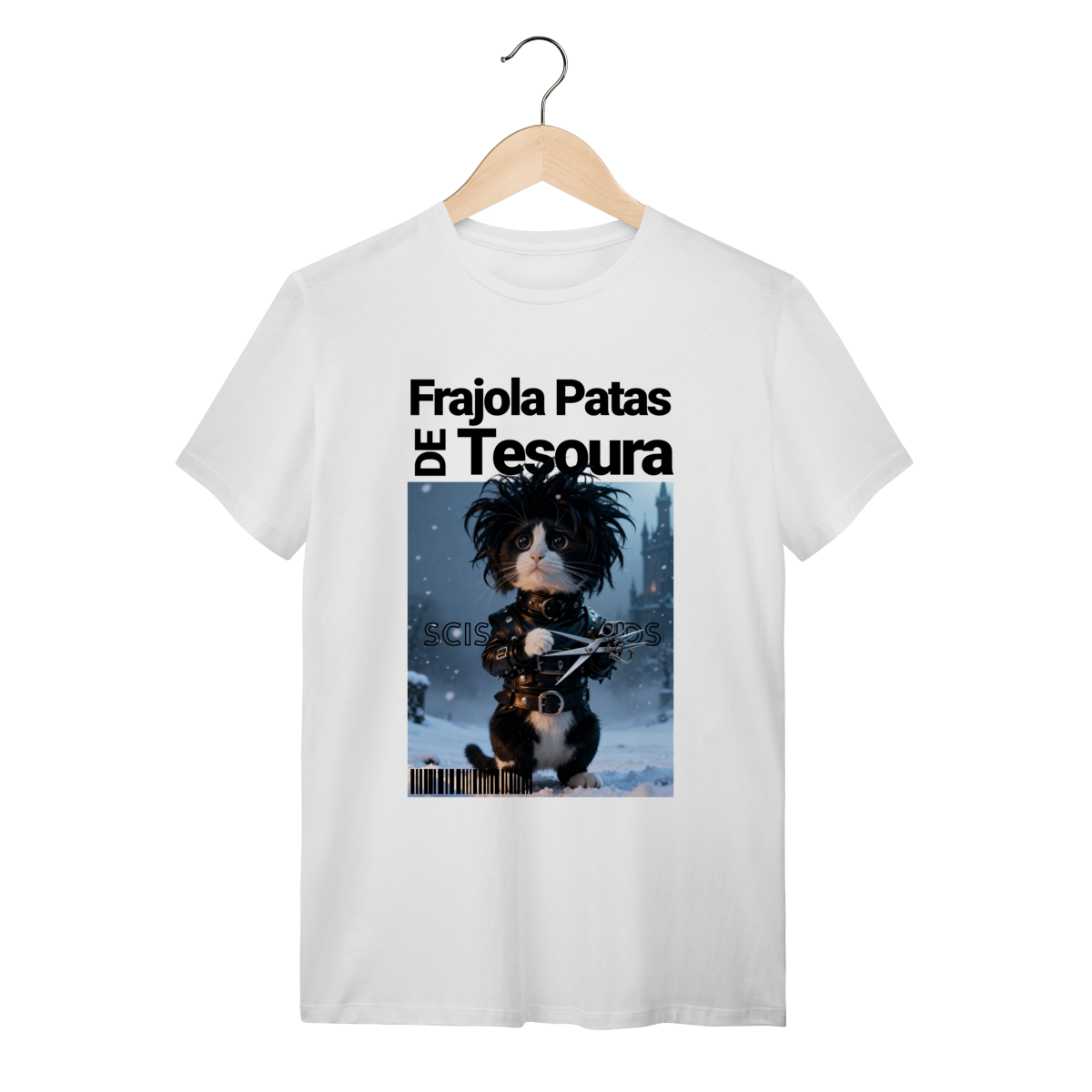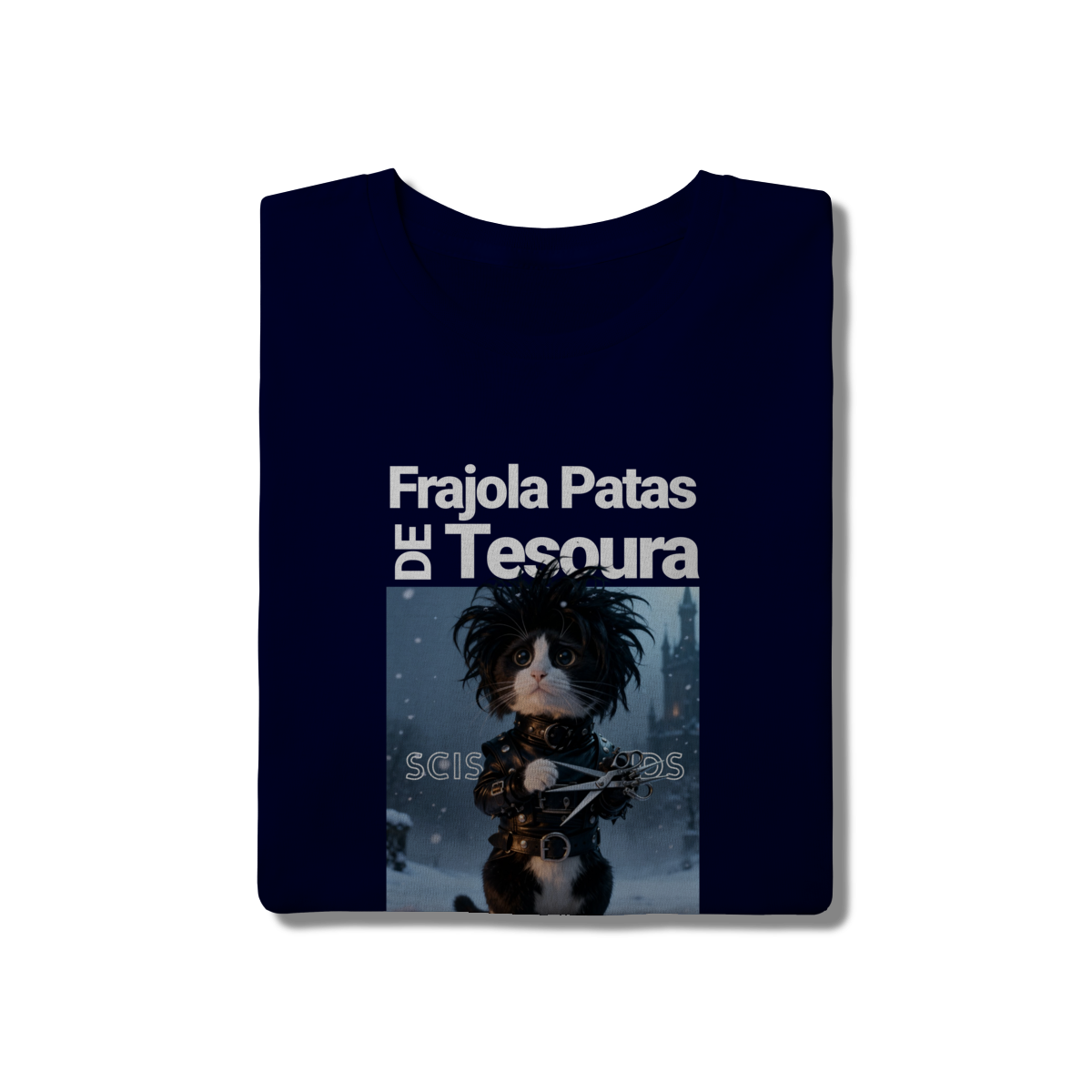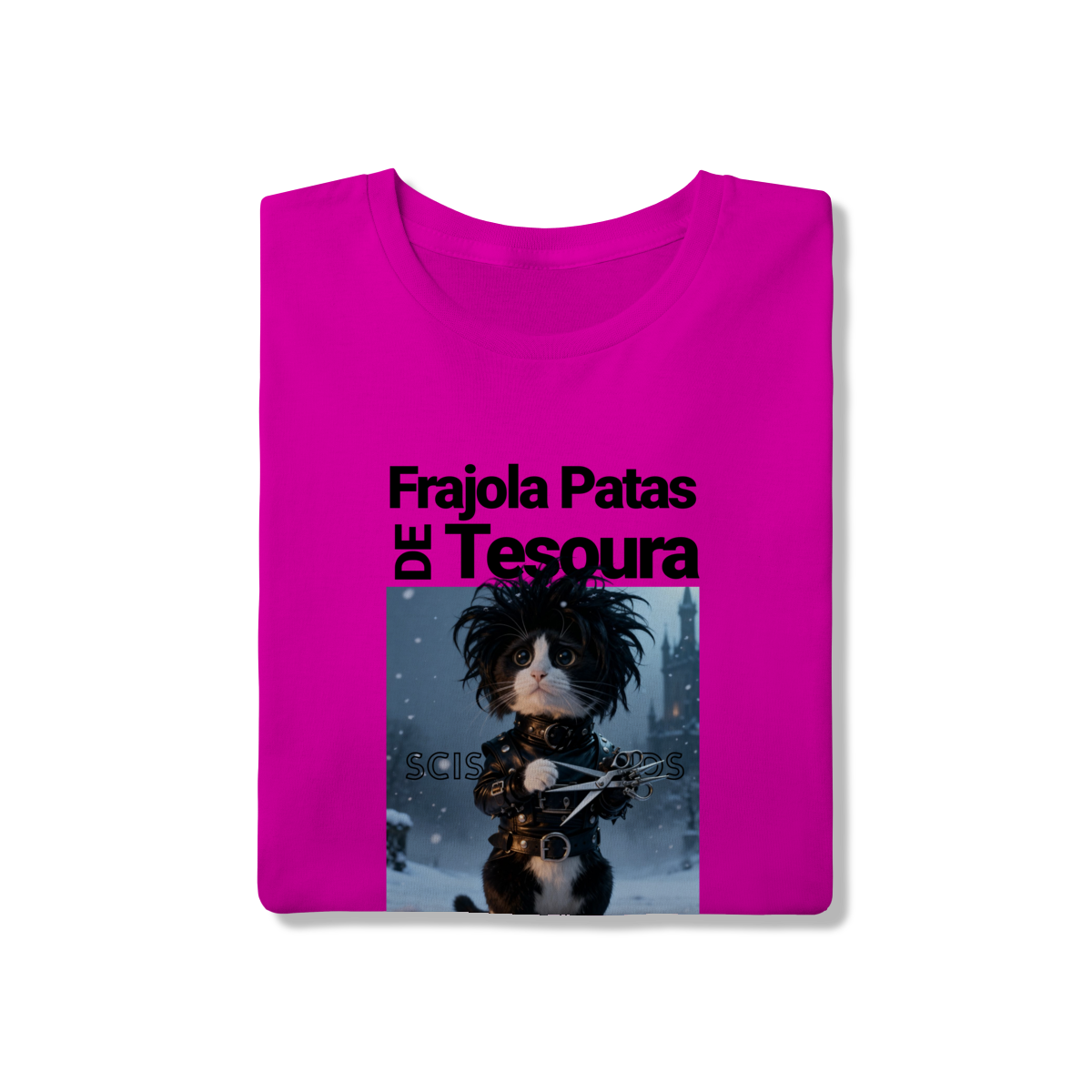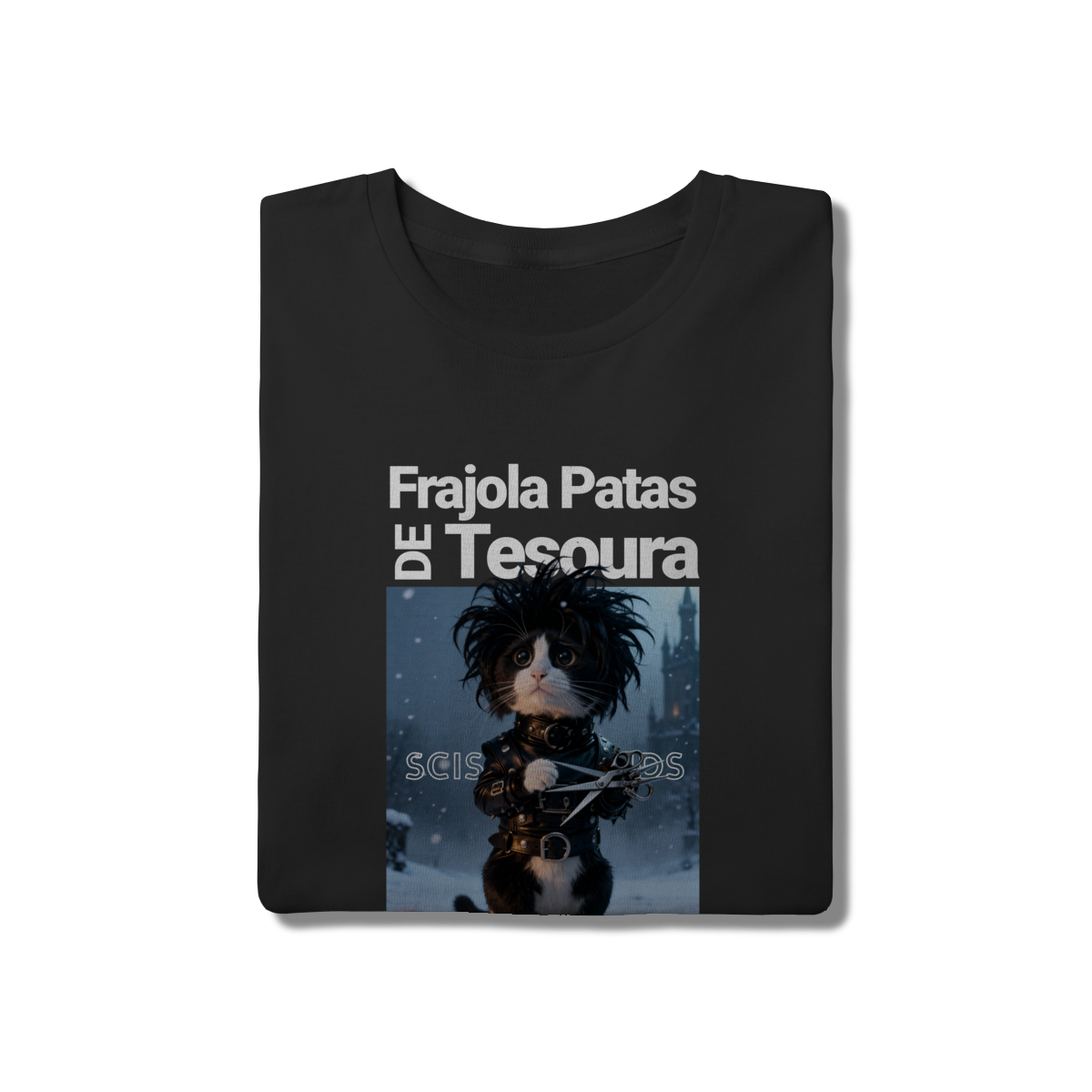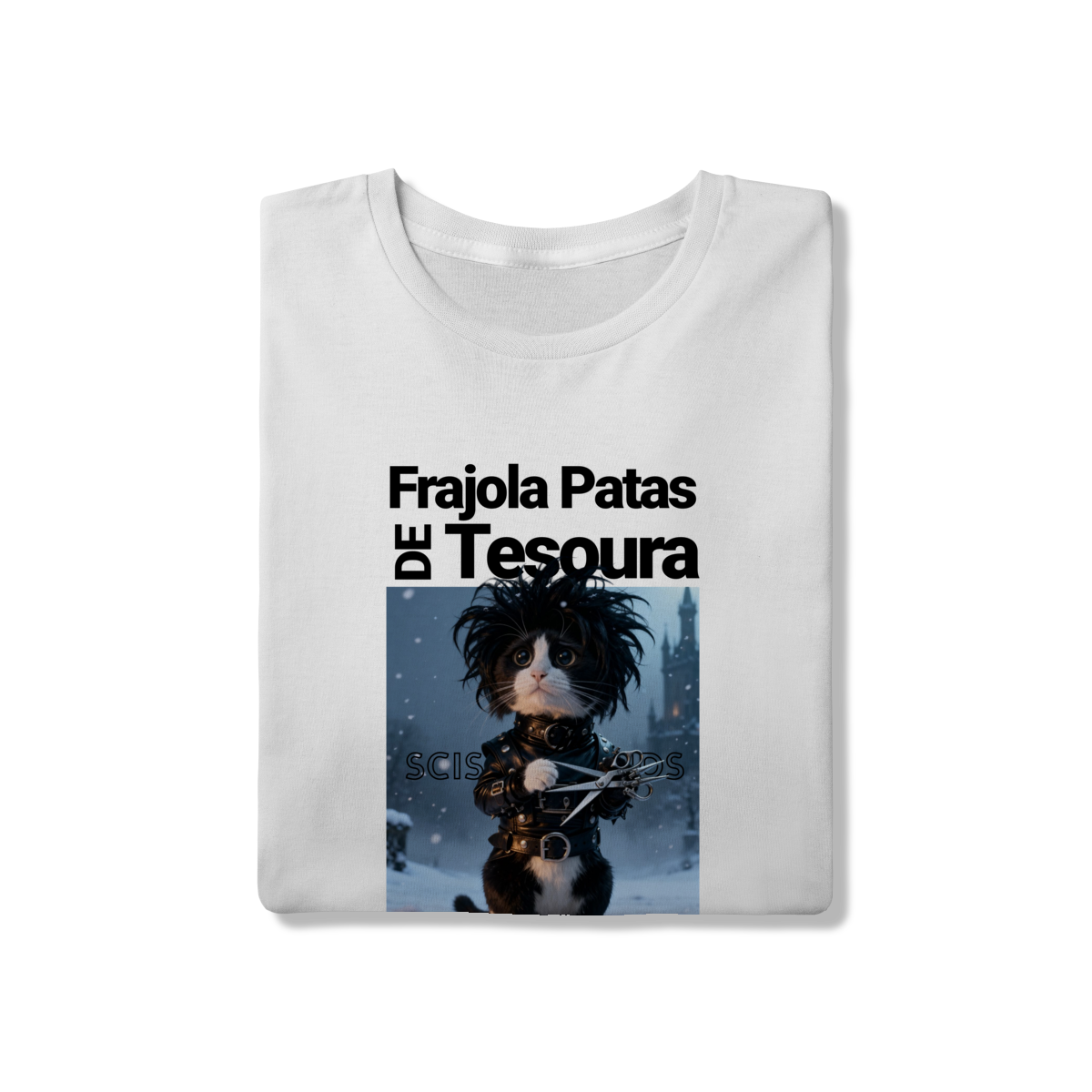 A camiseta “Frajola Patas de Tesoura” traz uma releitura divertida e estilizada do clássico personagem de tesouras — só que agora reinventado como um gatinho dramático, fofo e cheio de personalidade.