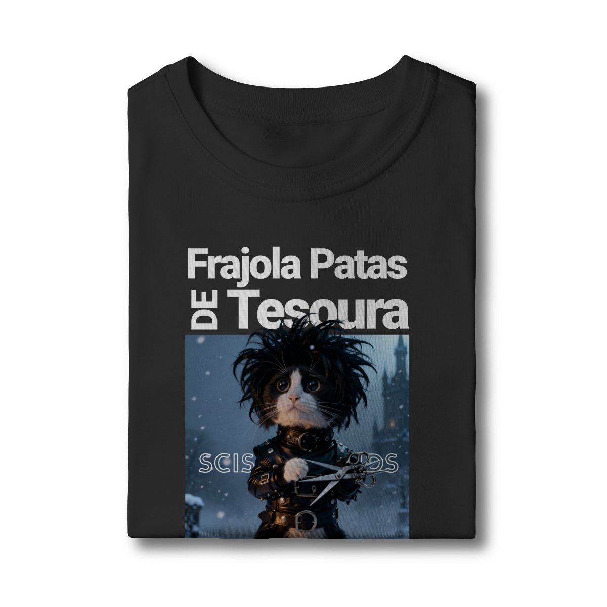 A camiseta “Frajola Patas de Tesoura” traz uma releitura divertida e estilizada do clássico personagem de tesouras — só que agora reinventado como um gatinho dramático, fofo e cheio de personalidade.