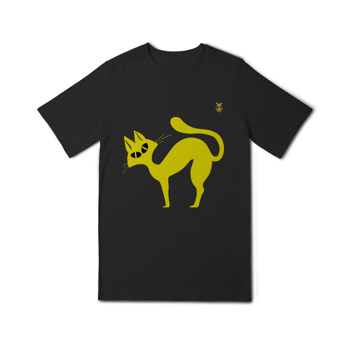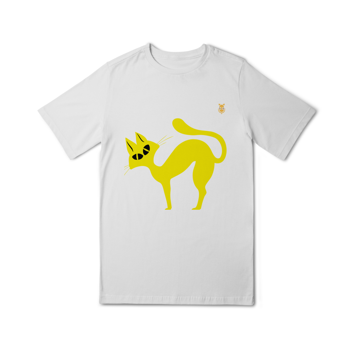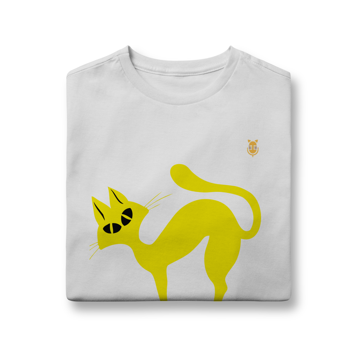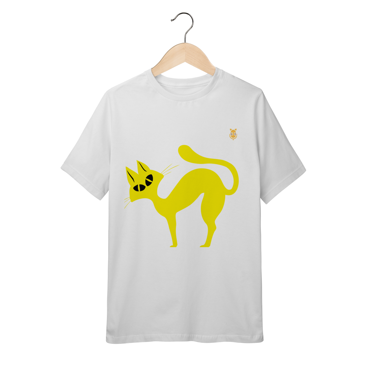 A  Gato Curioso traz um felino estilizado em linhas fluidas amarelas, com expressão intrigante e charme minimalista.