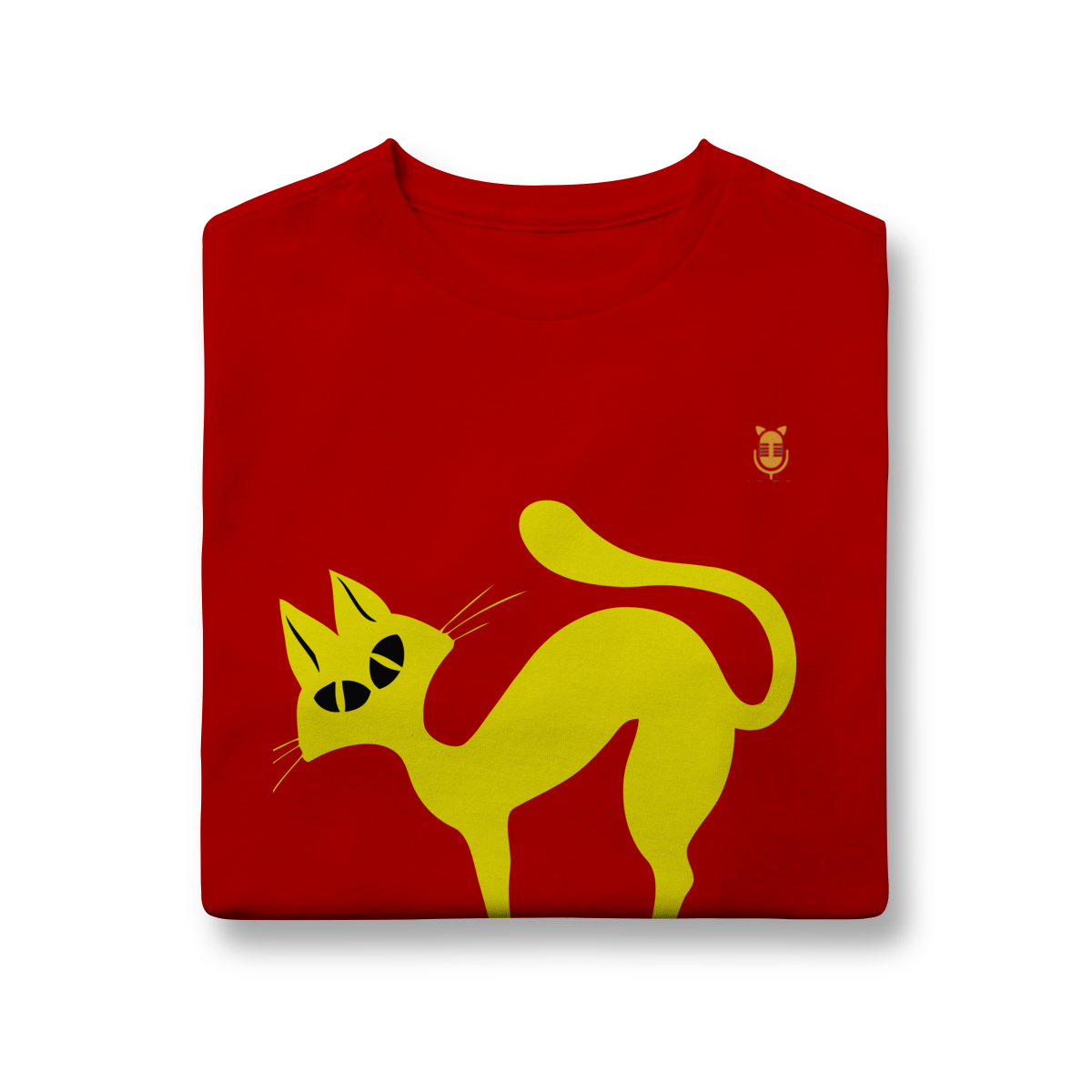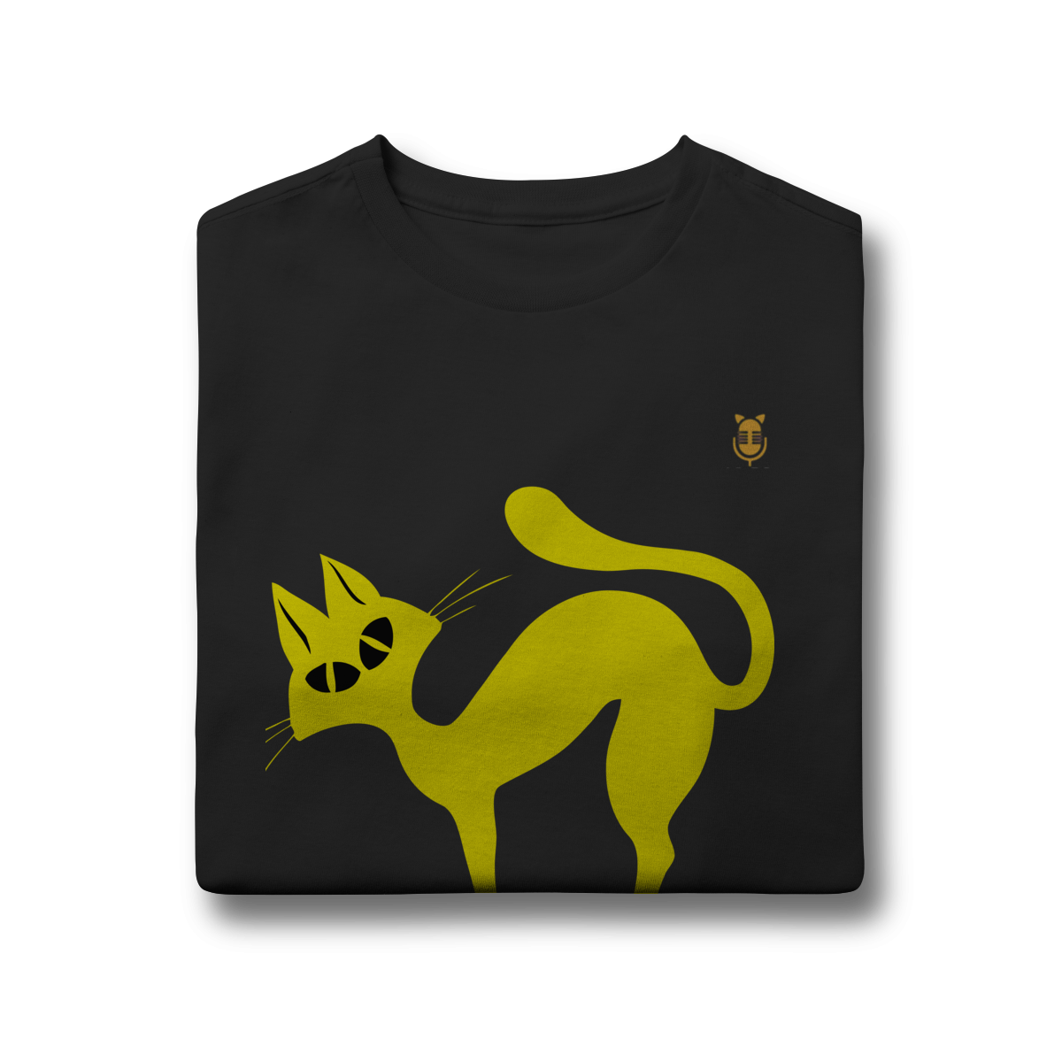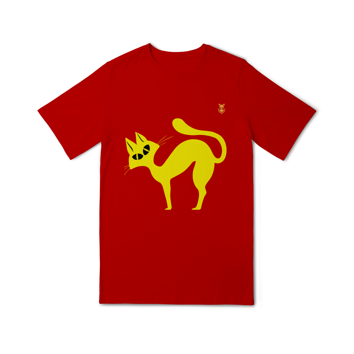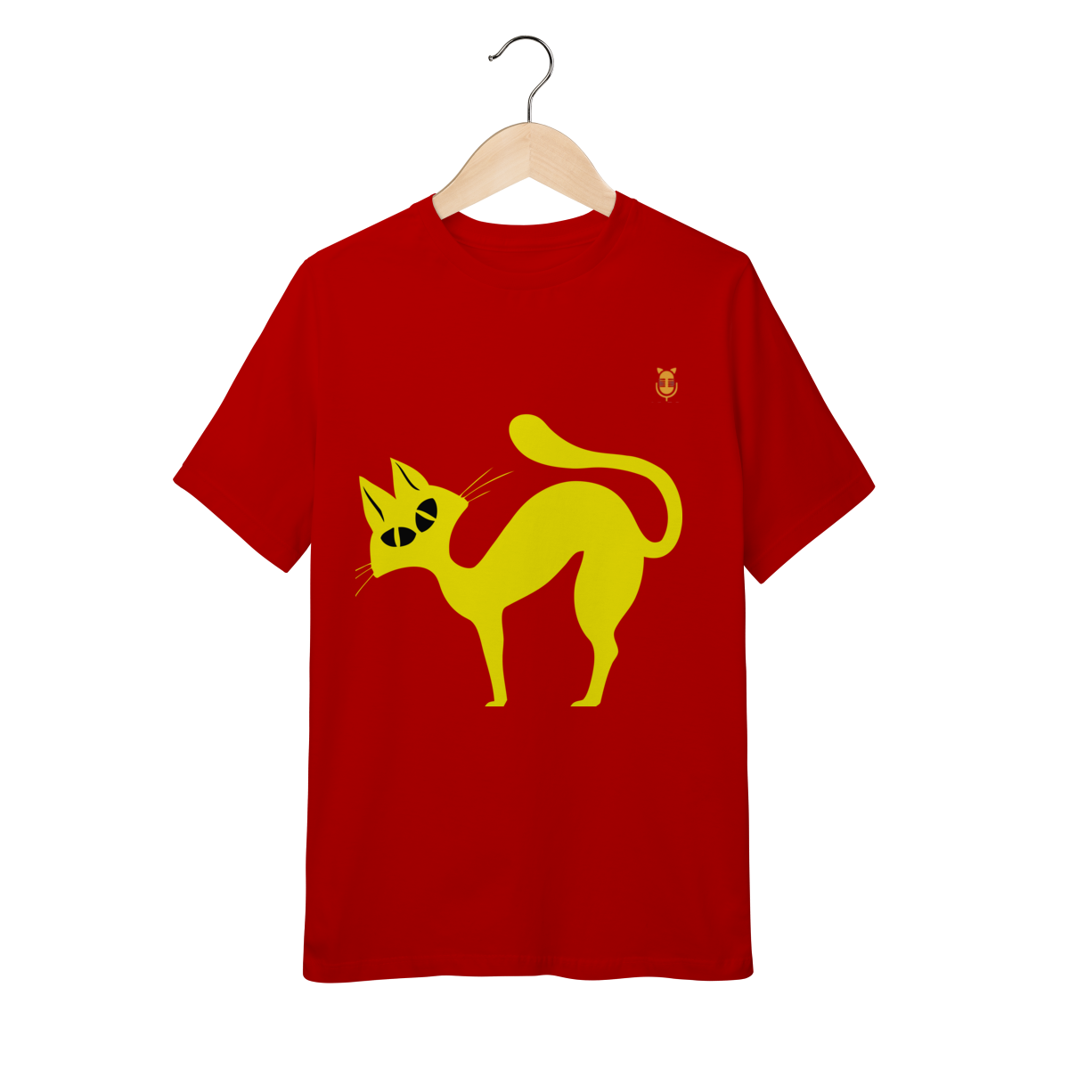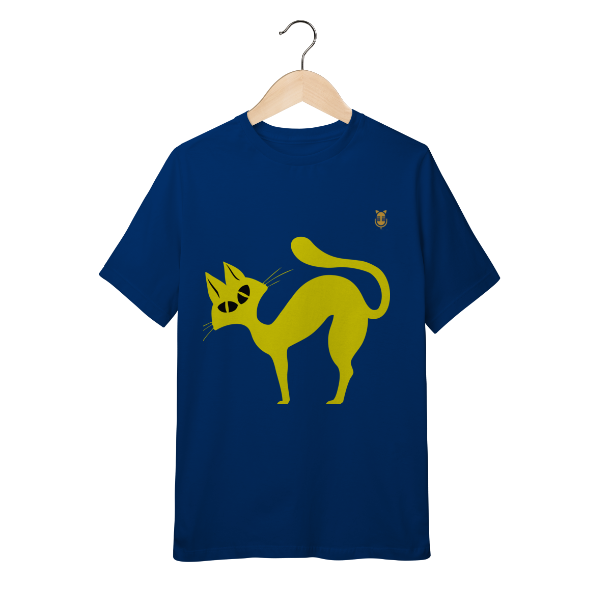 A  Gato Curioso traz um felino estilizado em linhas fluidas amarelas, com expressão intrigante e charme minimalista.