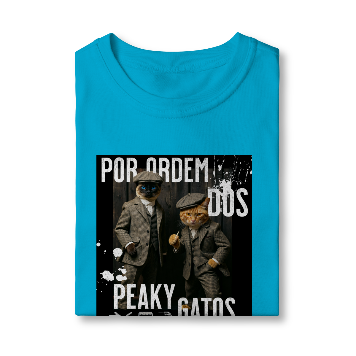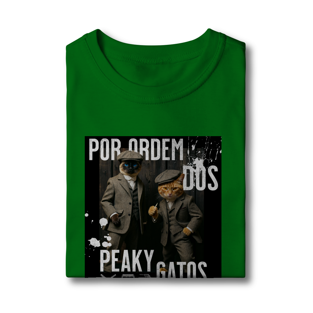 A camiseta Peaky Gatos traz uma paródia divertida no estilo de uma gangue clássica, agora representada por dois gatos vestidos de maneira elegante e com aquele ar sério típico dos personagens. A estampa tem visual marcante, moderno e cheio de atitude, perfeita para quem gosta de cultura pop, humor e camisetas criativas. Confortável e estilosa, combina com qualquer look do dia a dia.