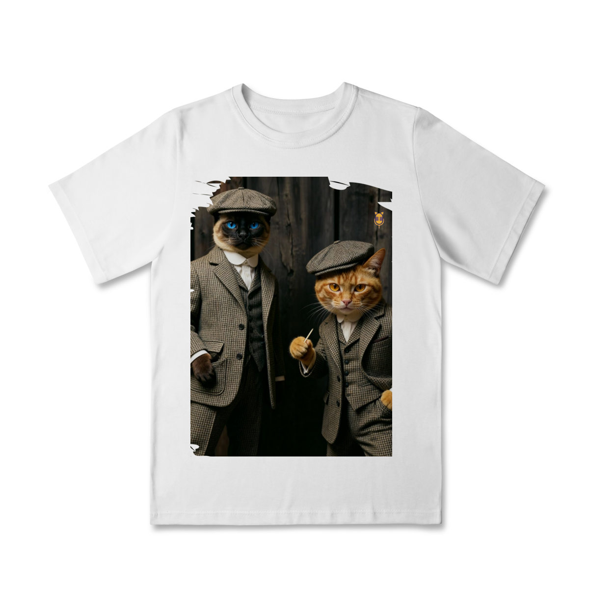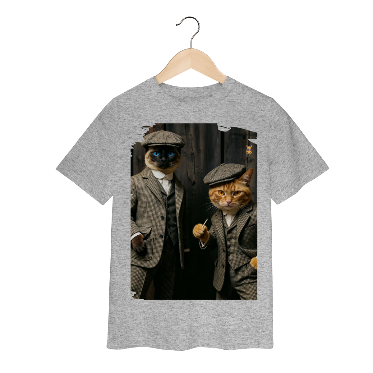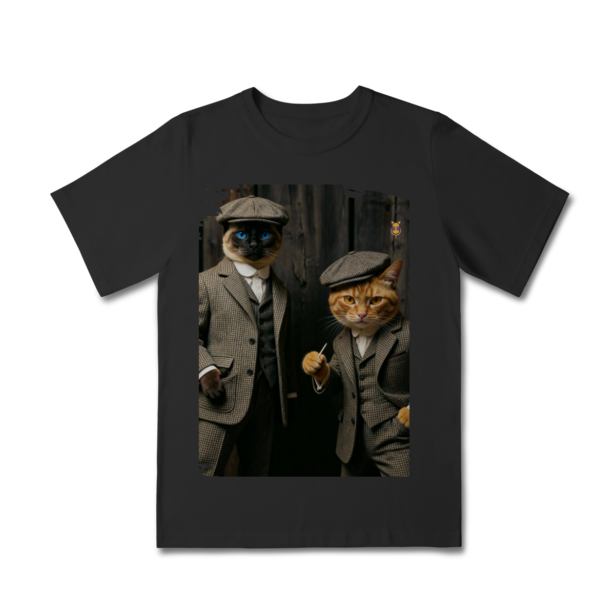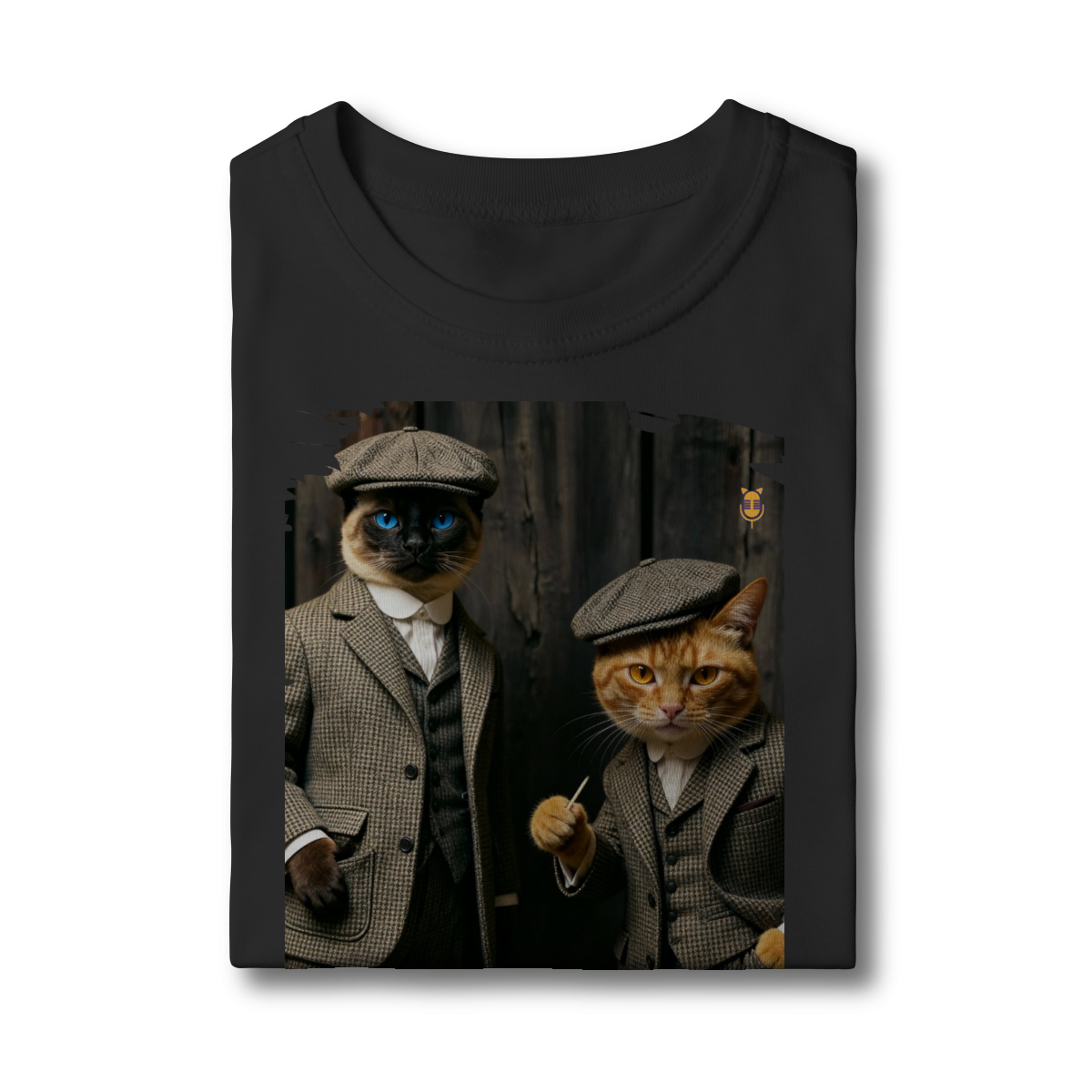 Esta estampa exclusiva traz dois gatos super estilosos vestidos como verdadeiros gângsteres da era vintage. Com ternos xadrez clássicos, boinas tradicionais e poses cheias de atitude, o duo felino transmite charme, humor e personalidade.