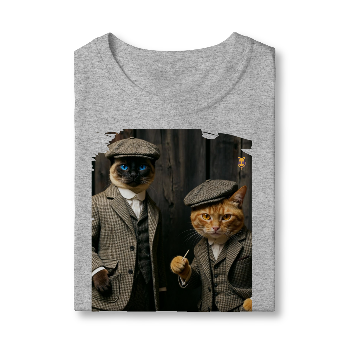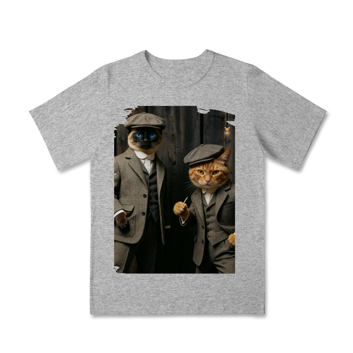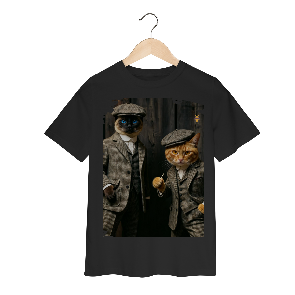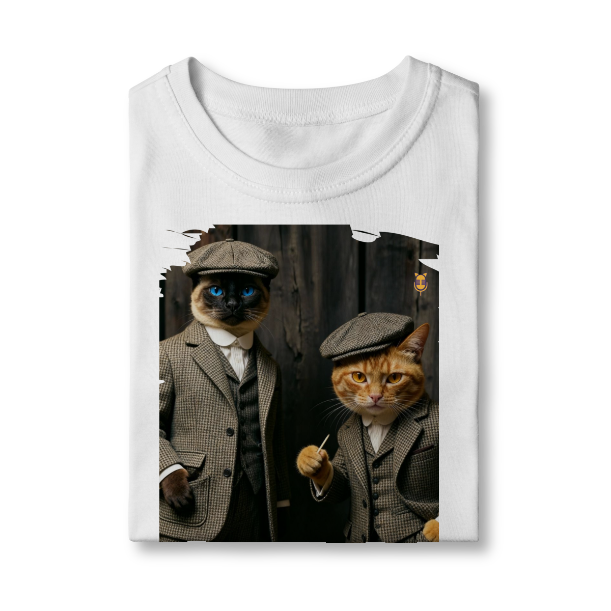 Esta estampa exclusiva traz dois gatos super estilosos vestidos como verdadeiros gângsteres da era vintage. Com ternos xadrez clássicos, boinas tradicionais e poses cheias de atitude, o duo felino transmite charme, humor e personalidade.