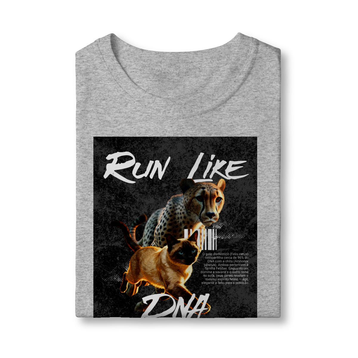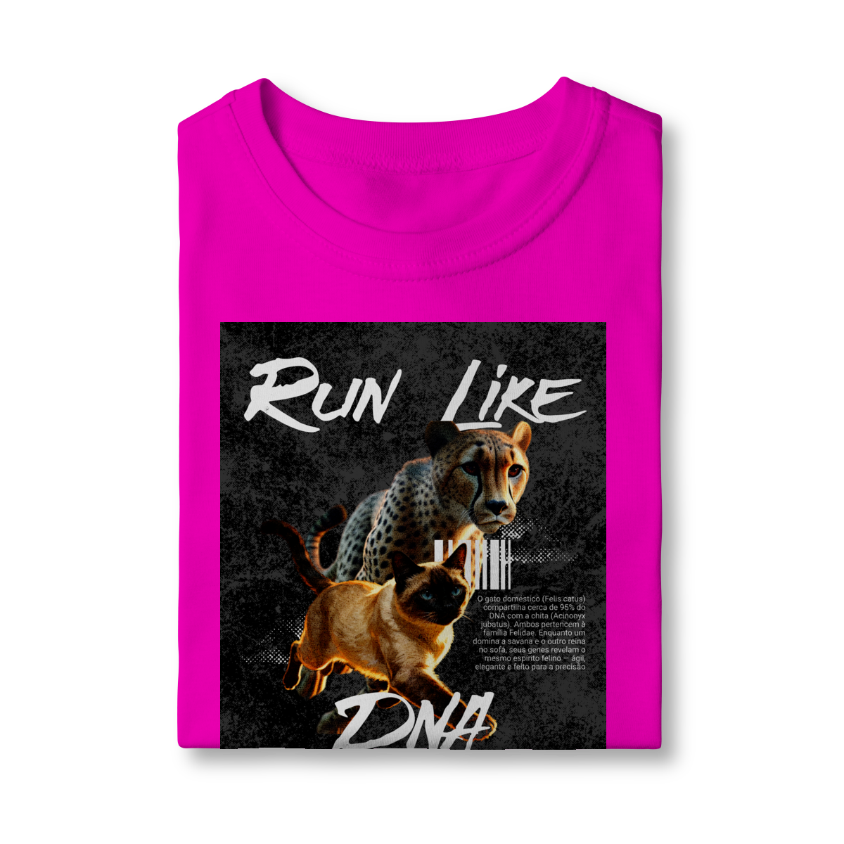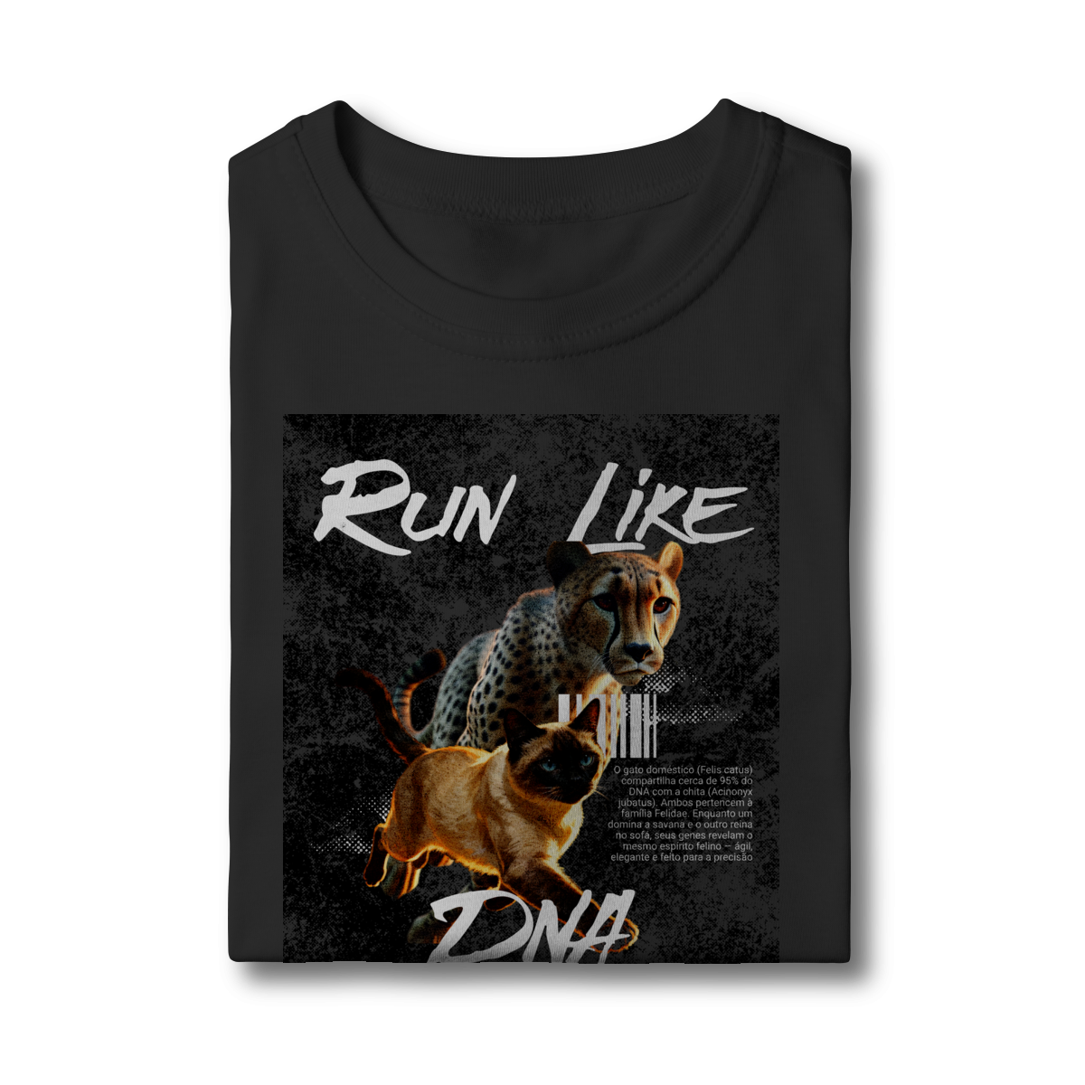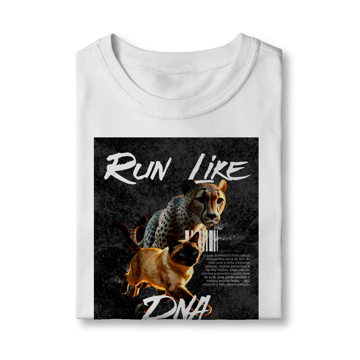 A camiseta Run Like DNA traz uma estampa divertida e cheia de energia, mostrando um gato correndo com atitude ao lado de um felino estilizado em pose dinâmica. A arte tem visual esportivo e moderno, perfeita para quem gosta de humor, gatos e camisetas com tema de ação. Confortável e estilosa, combina com looks casuais e é uma ótima opção para presentear.