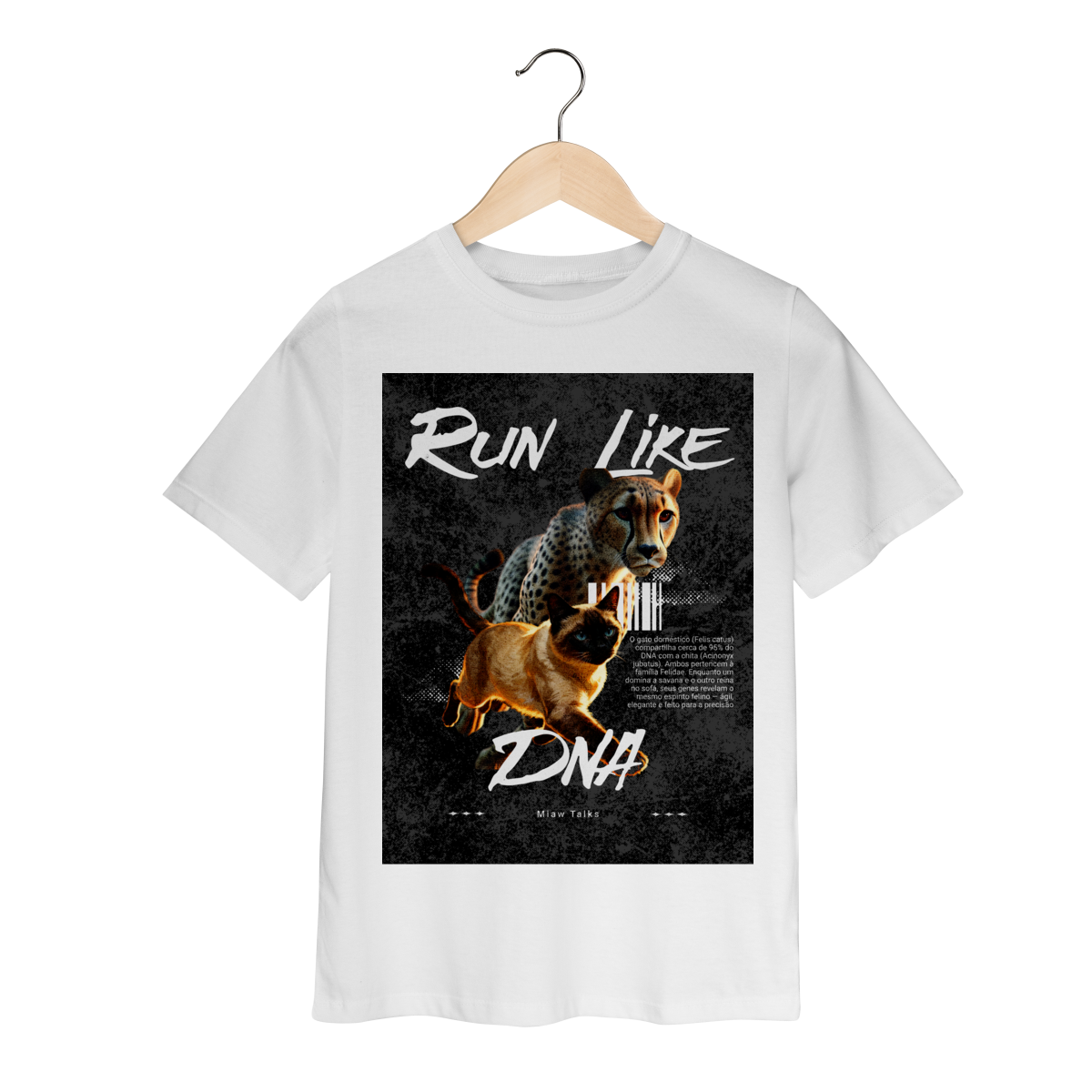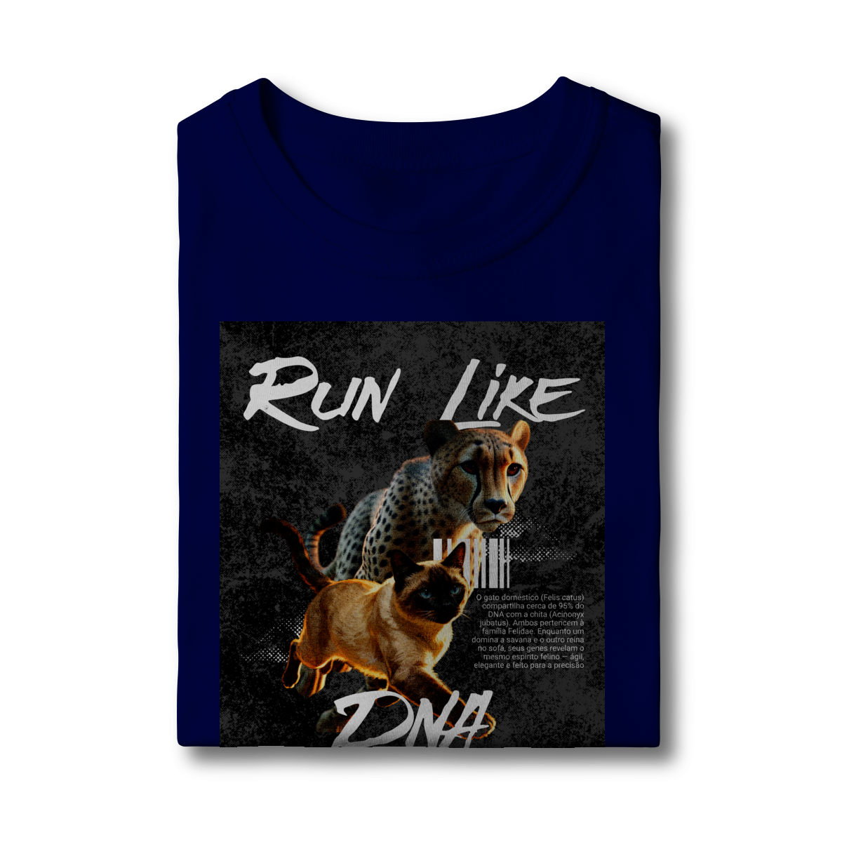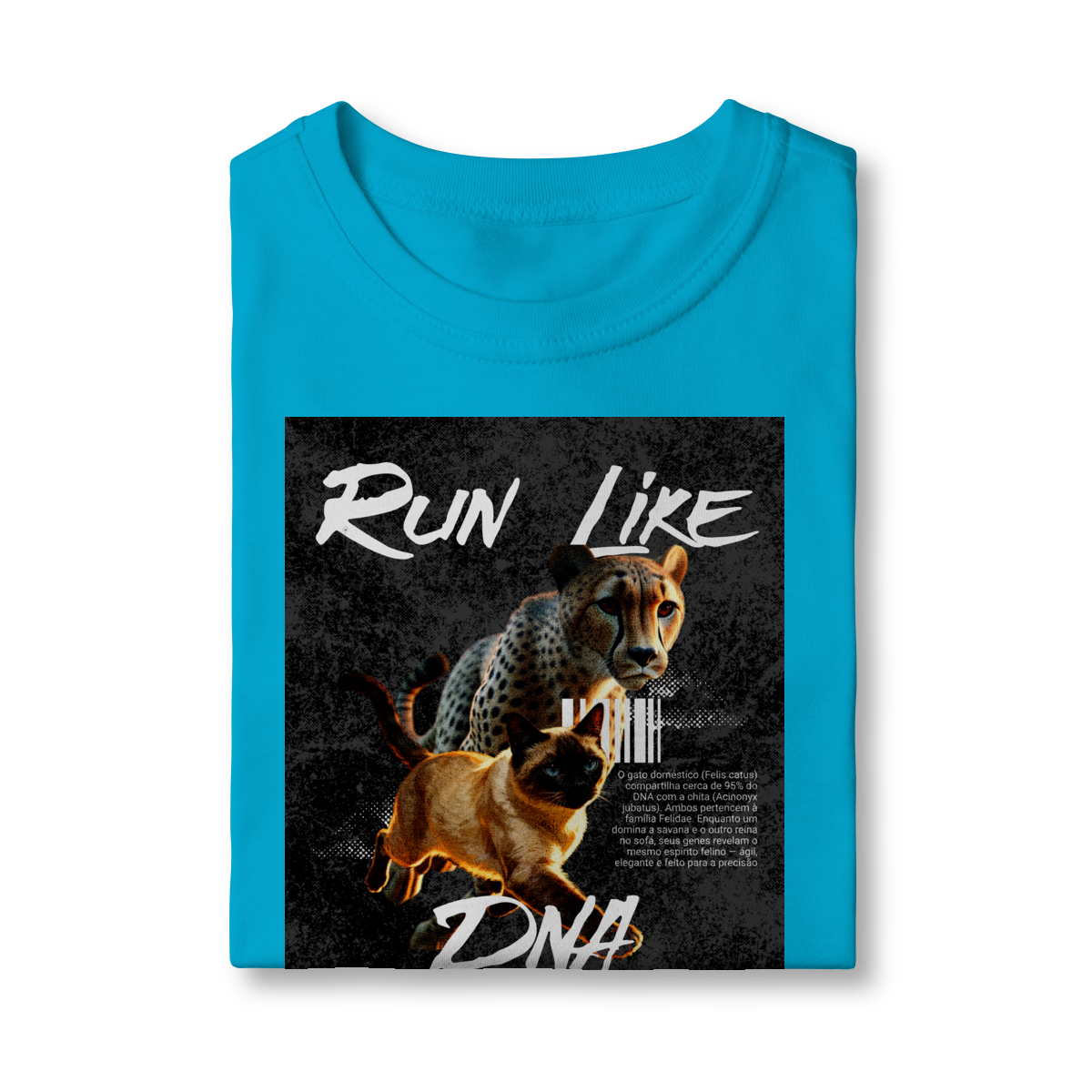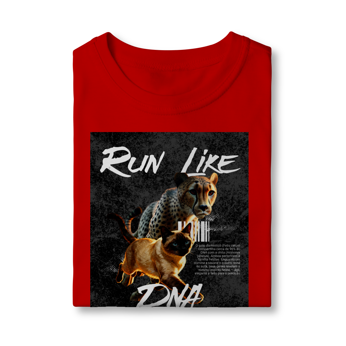 A camiseta Run Like DNA traz uma estampa divertida e cheia de energia, mostrando um gato correndo com atitude ao lado de um felino estilizado em pose dinâmica. A arte tem visual esportivo e moderno, perfeita para quem gosta de humor, gatos e camisetas com tema de ação. Confortável e estilosa, combina com looks casuais e é uma ótima opção para presentear.