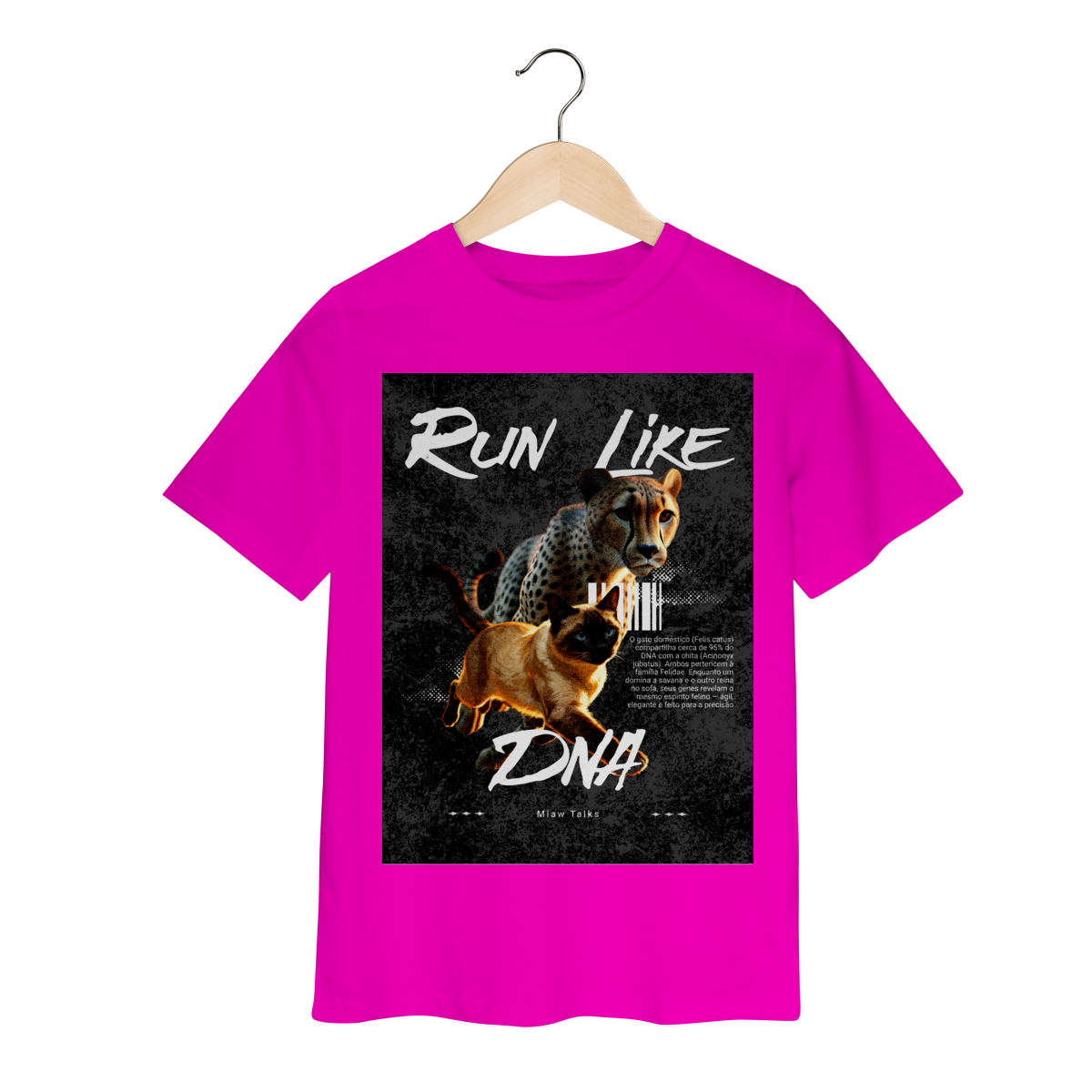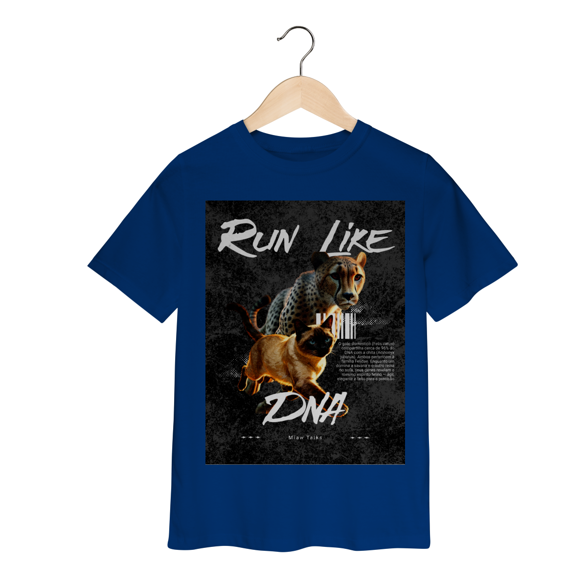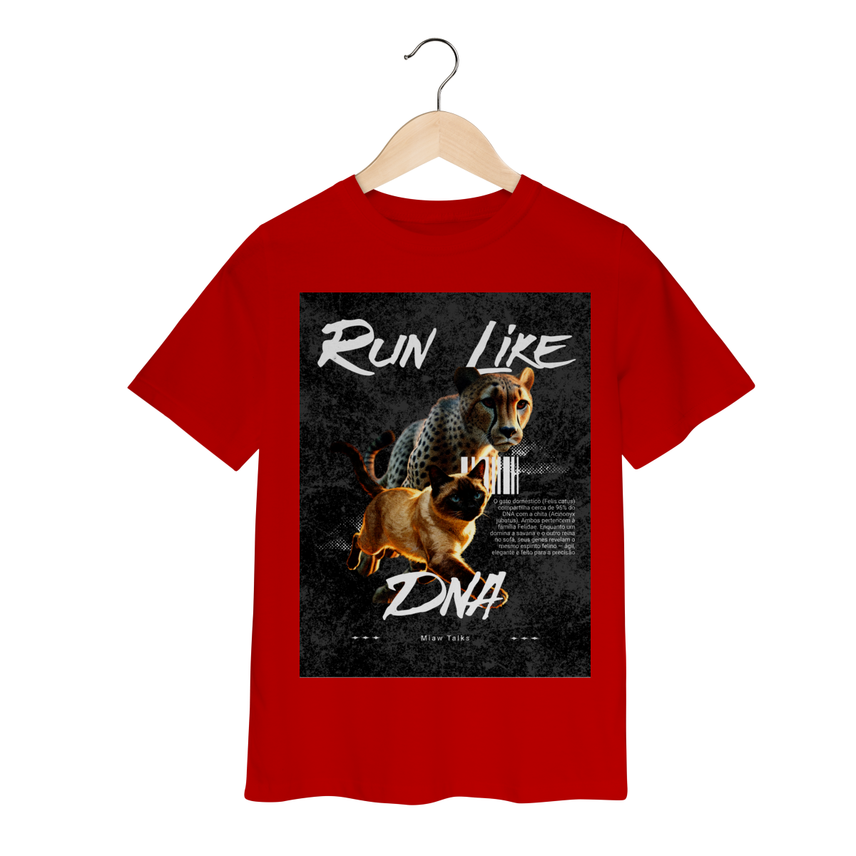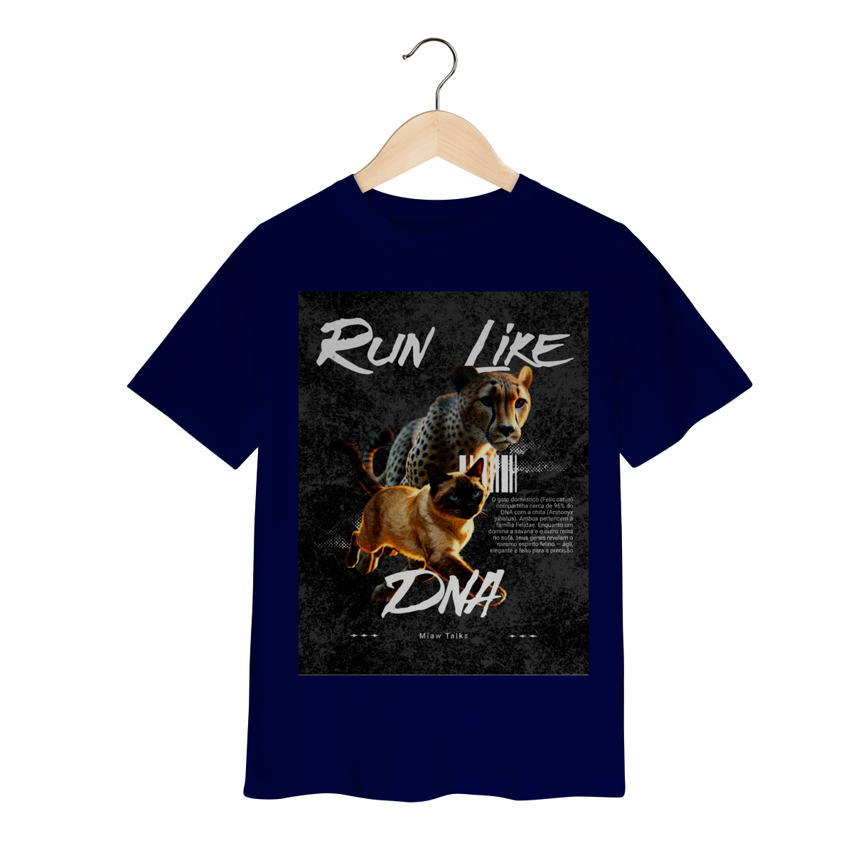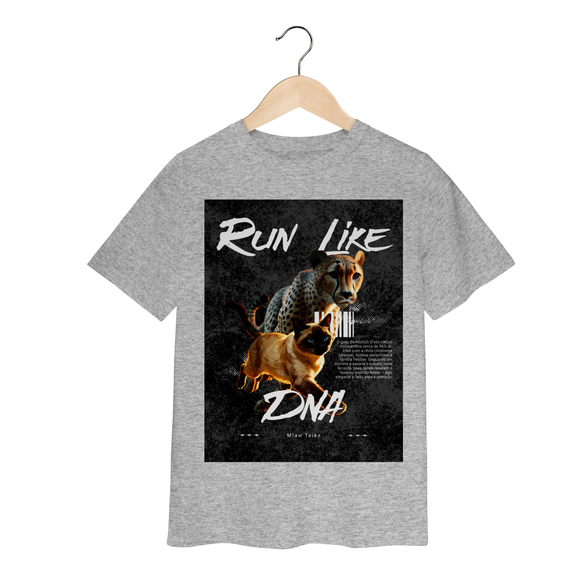 A camiseta Run Like DNA traz uma estampa divertida e cheia de energia, mostrando um gato correndo com atitude ao lado de um felino estilizado em pose dinâmica. A arte tem visual esportivo e moderno, perfeita para quem gosta de humor, gatos e camisetas com tema de ação. Confortável e estilosa, combina com looks casuais e é uma ótima opção para presentear.