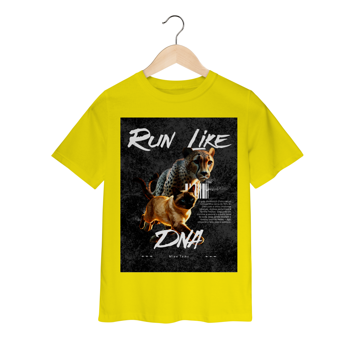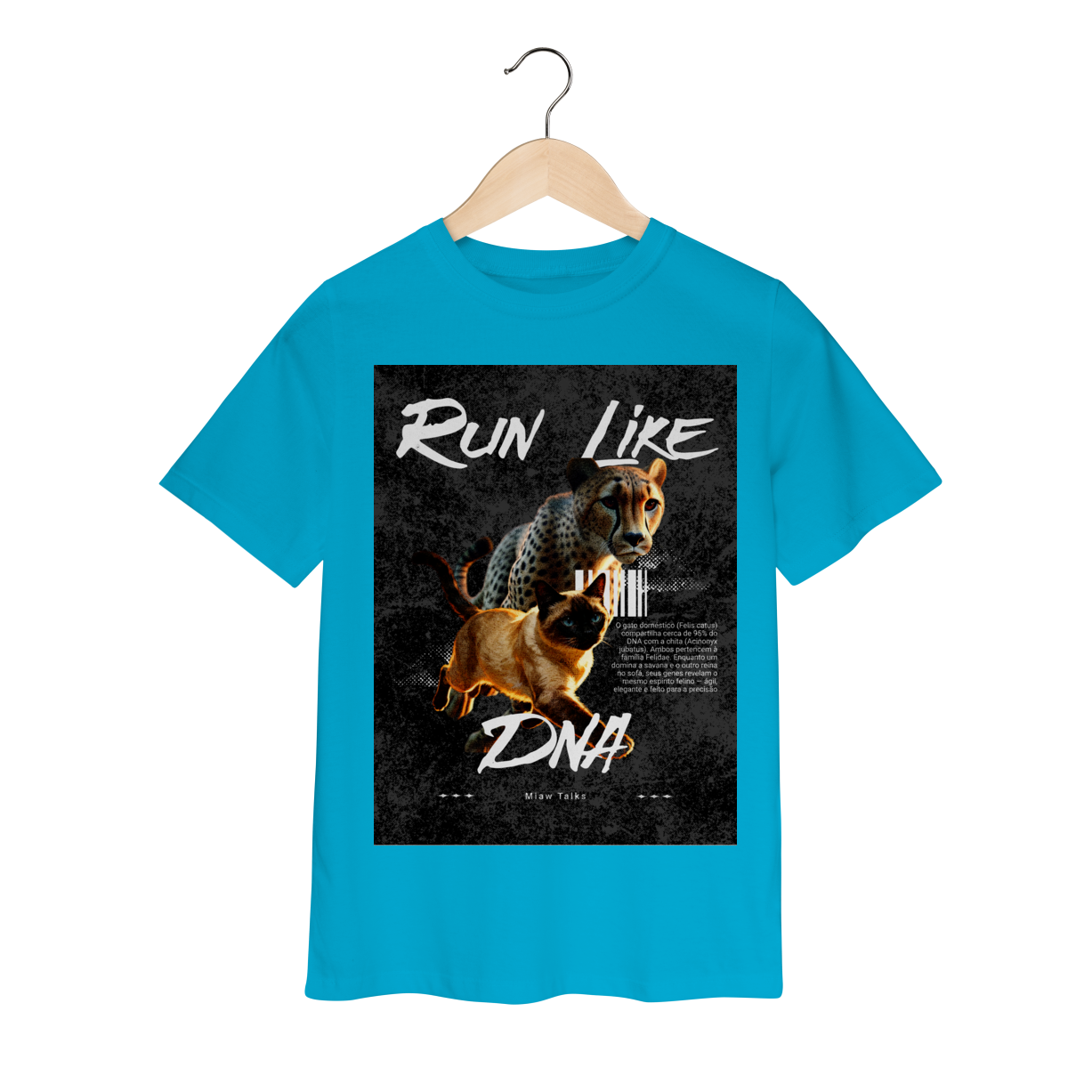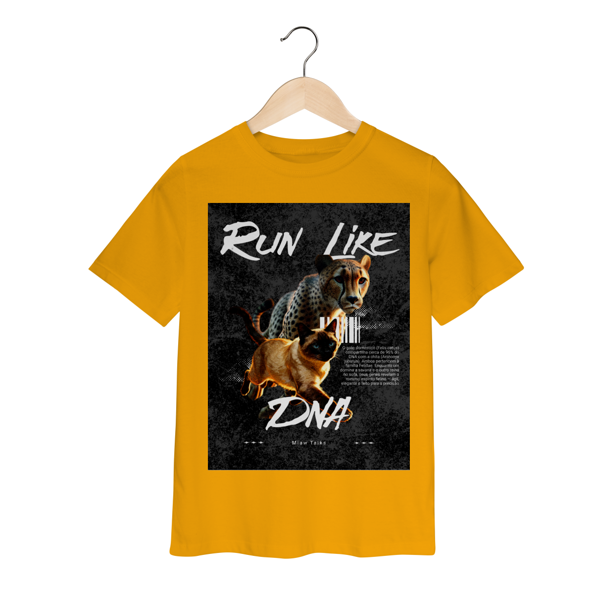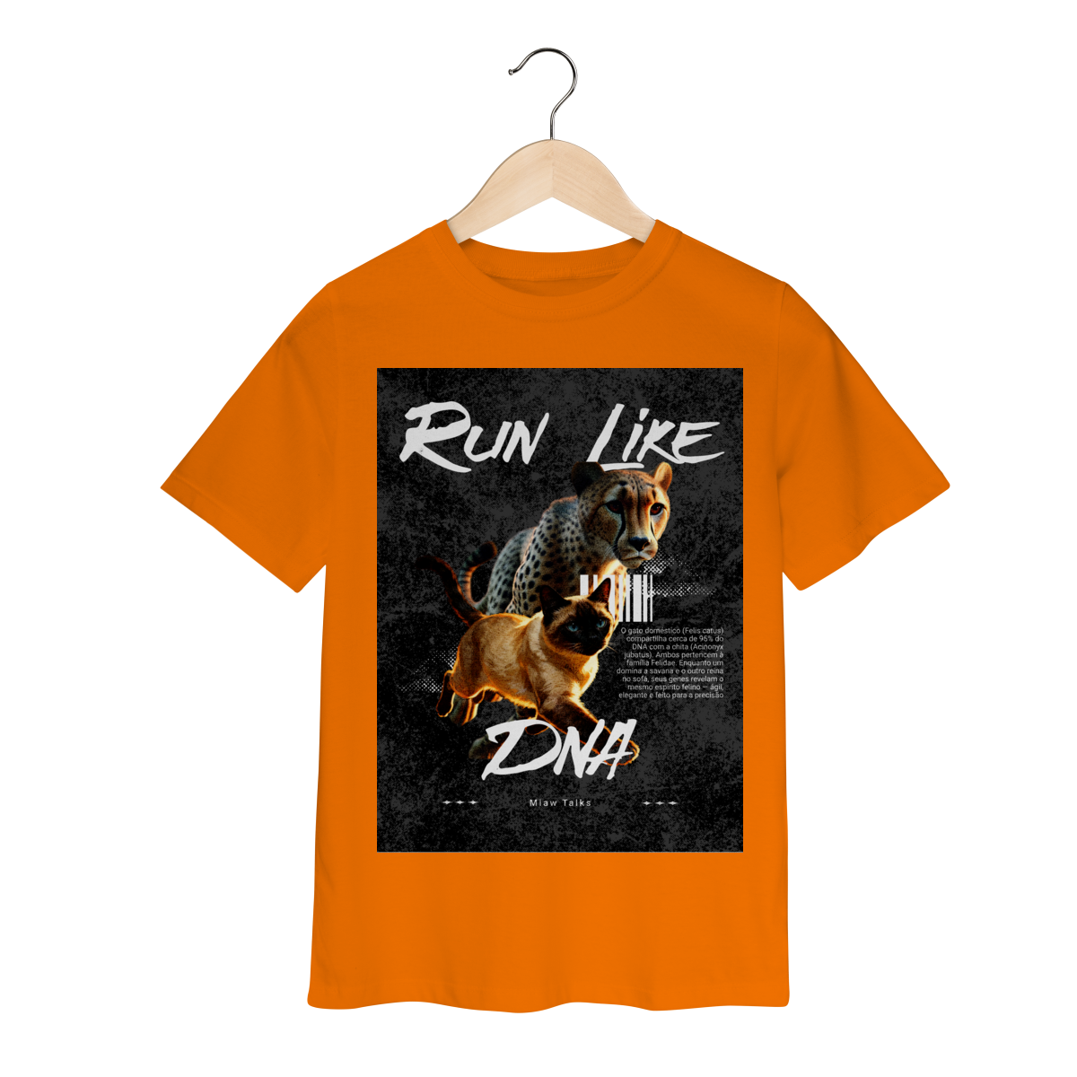 A camiseta Run Like DNA traz uma estampa divertida e cheia de energia, mostrando um gato correndo com atitude ao lado de um felino estilizado em pose dinâmica. A arte tem visual esportivo e moderno, perfeita para quem gosta de humor, gatos e camisetas com tema de ação. Confortável e estilosa, combina com looks casuais e é uma ótima opção para presentear.