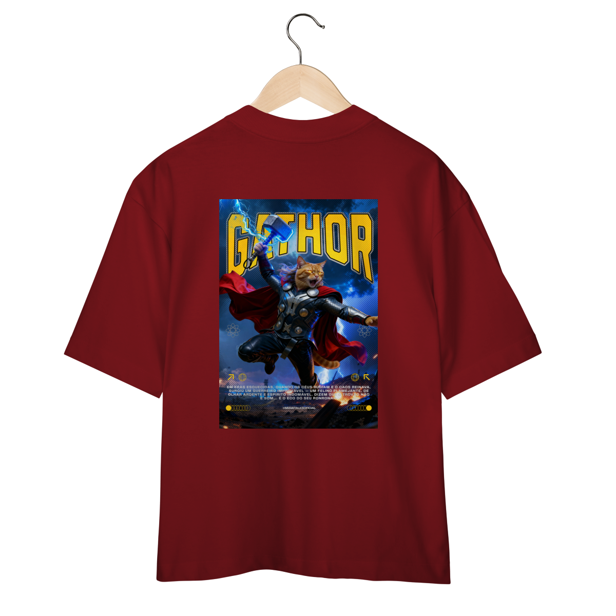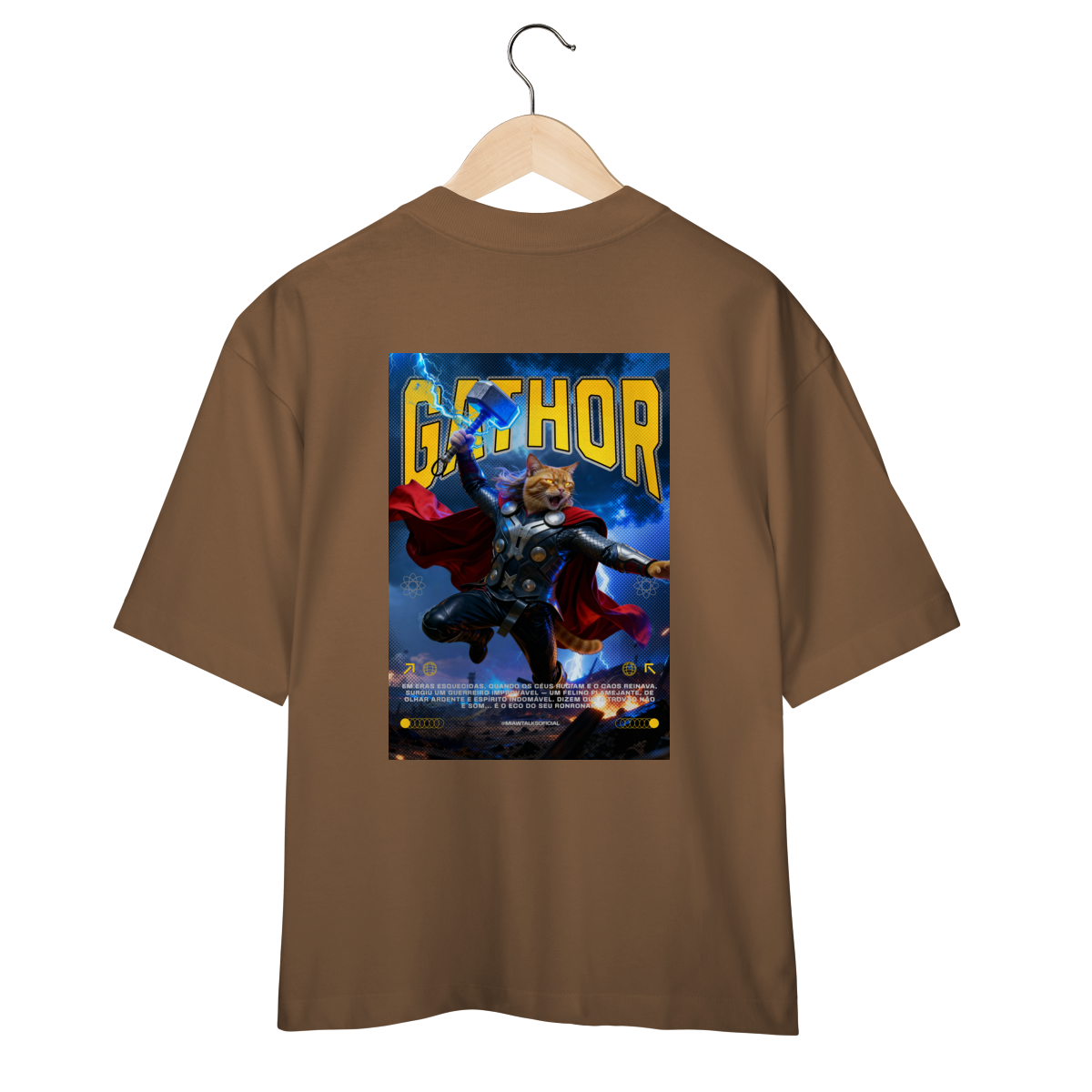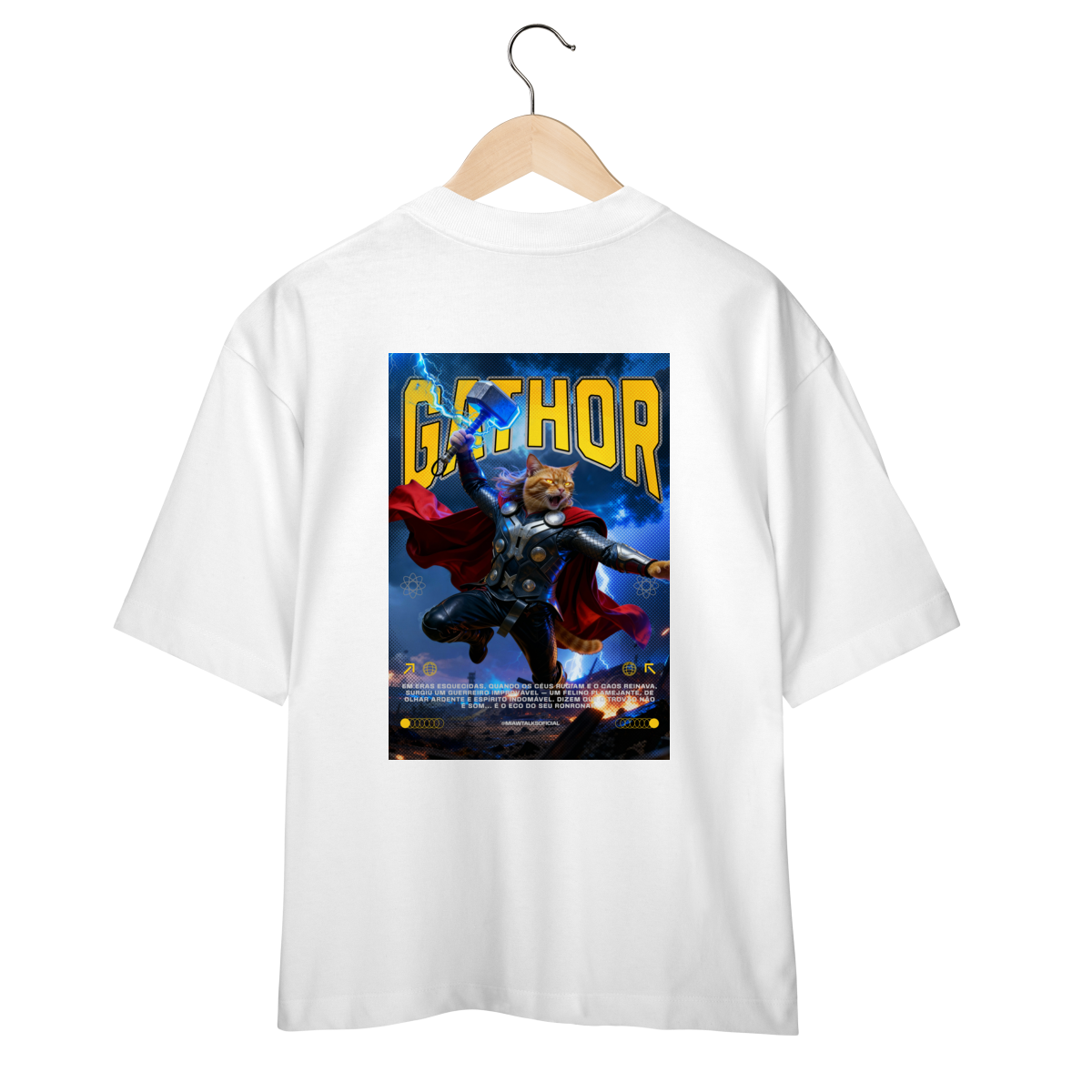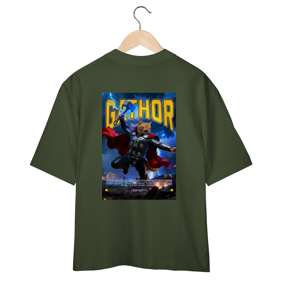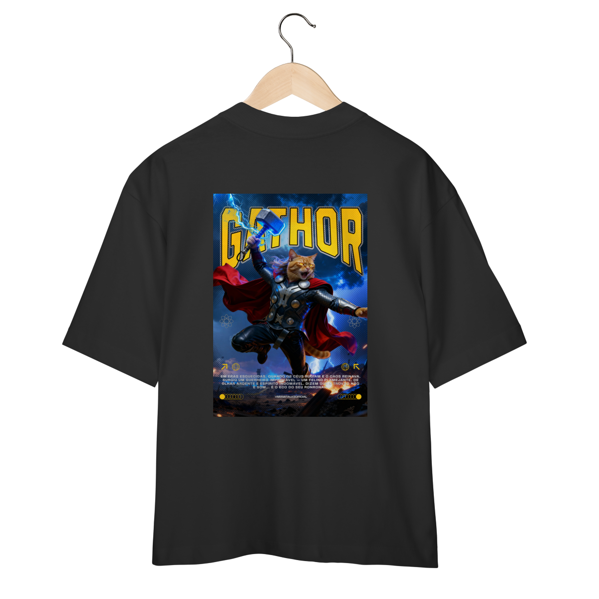 A camiseta Gathor traz uma paródia divertida do deus do trovão, agora reimaginado como um gato herói superpoderoso. A estampa é vibrante, cheia de ação e perfeita para quem ama gatos, humor e cultura pop. Confortável e estilosa, é uma ótima opção para usar no dia a dia ou presentear alguém que adora camisetas criativas.