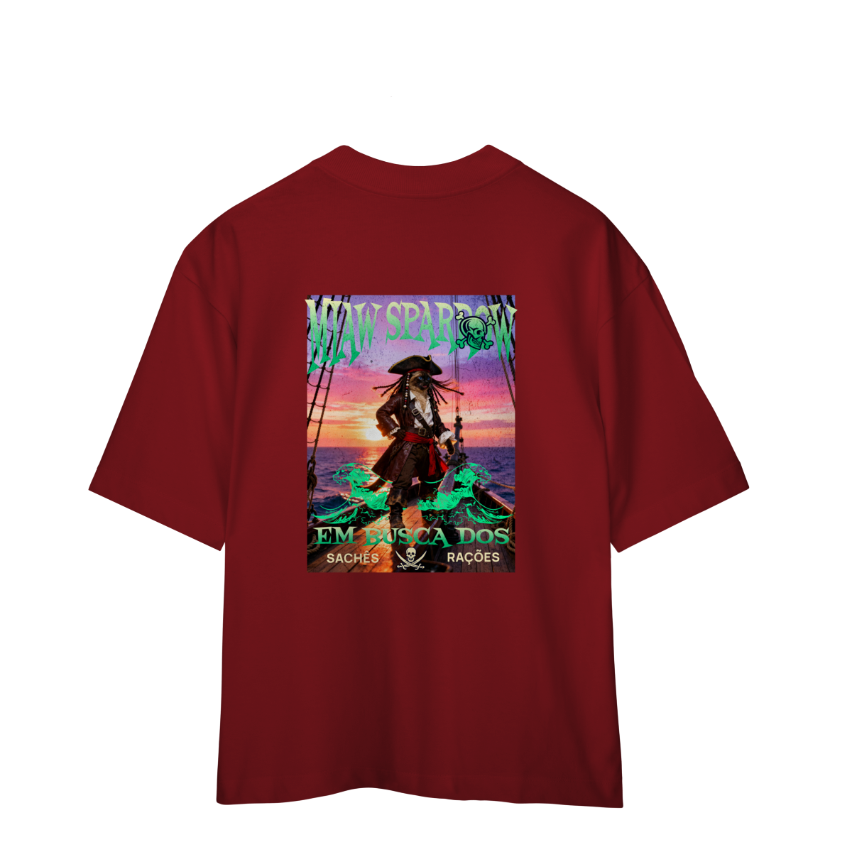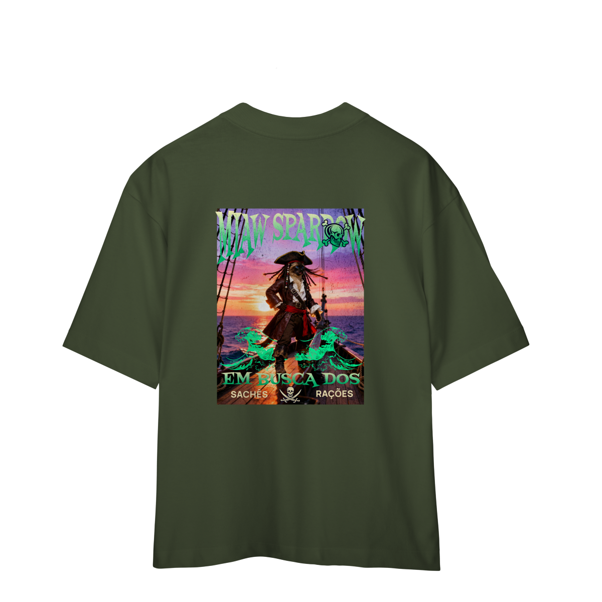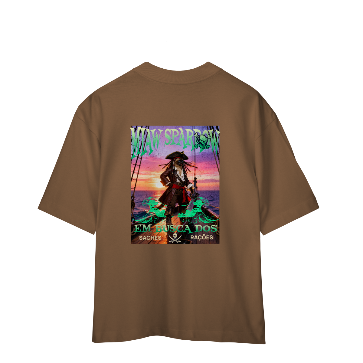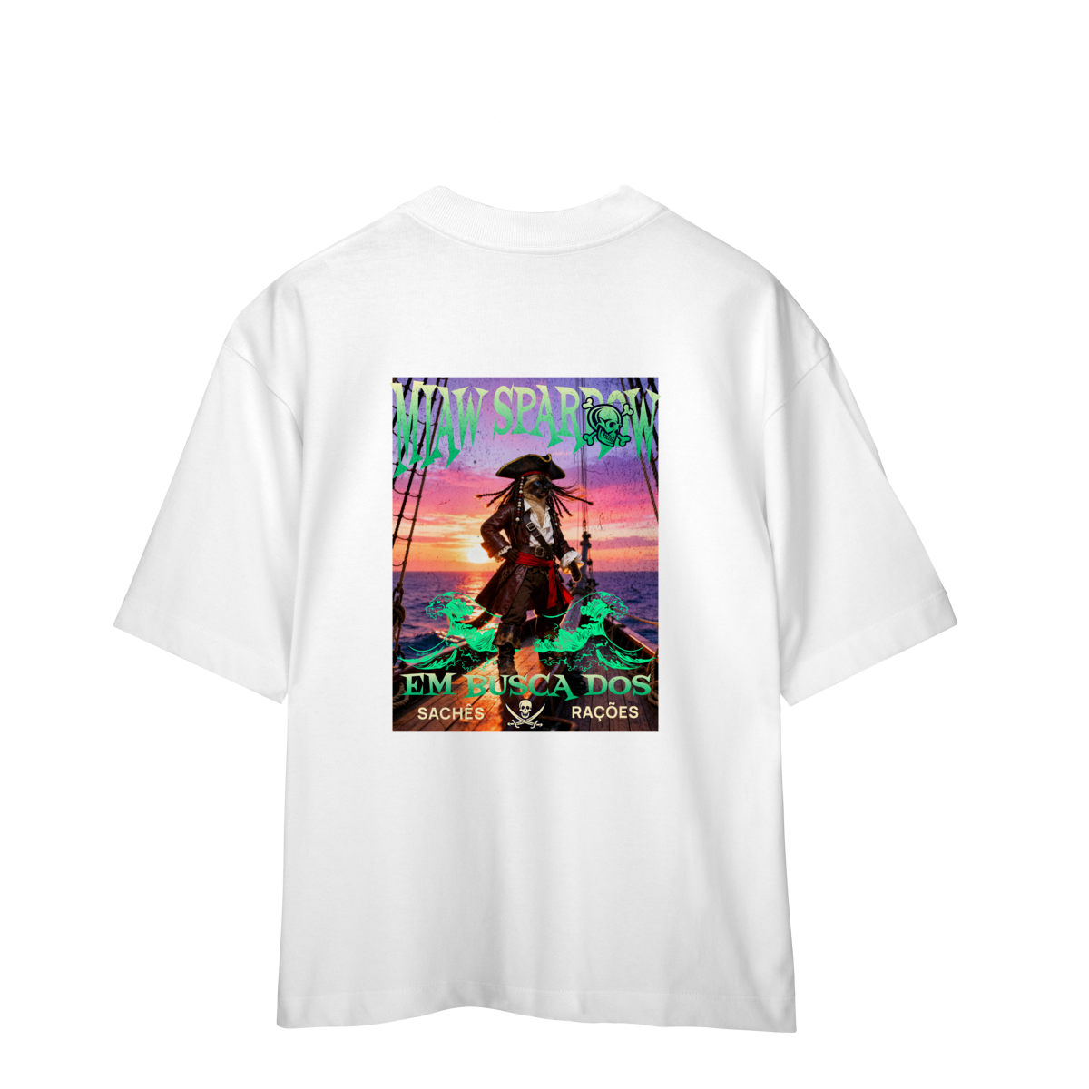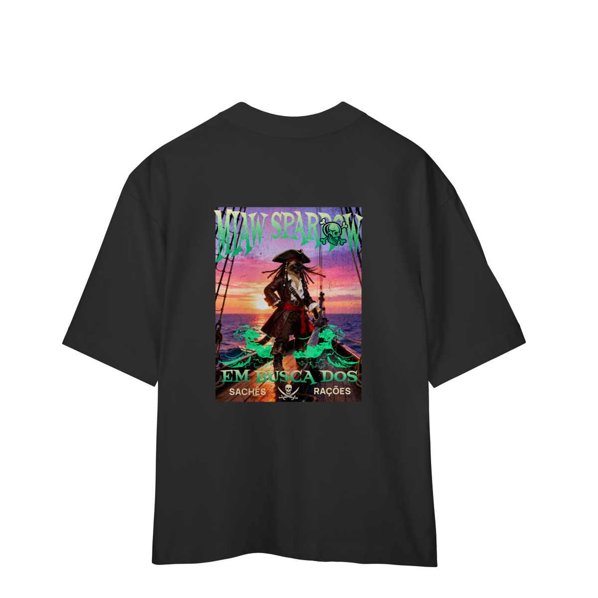 A camiseta Miaw Sparrow traz uma paródia divertida de um pirata famoso, reimaginado como um gato aventureiro. A estampa tem clima de ação e fantasia, com cores vibrantes e visual estiloso. É perfeita para quem ama gatos, humor e camisetas criativas. Confortável e moderna, combina com qualquer look e é uma ótima opção de presente.