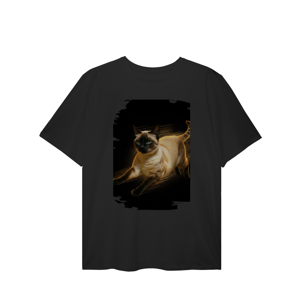 A arte transmite velocidade, atitude e elegância felina, perfeita para quem ama gatos ativos e estampas que passam a sensação de ação e liberdade.