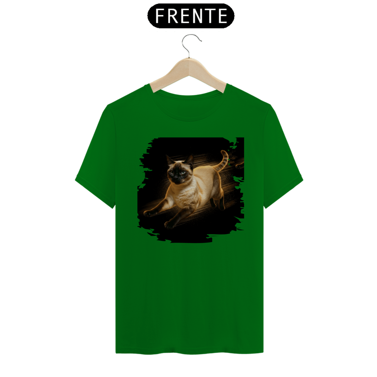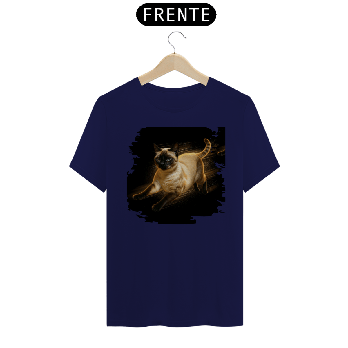 Elegância em movimento. A camiseta Kikito em Ação –traz um gato siamês em alta velocidade, envolto por um brilho dourado que destaca sua beleza, presença e atitude felina.