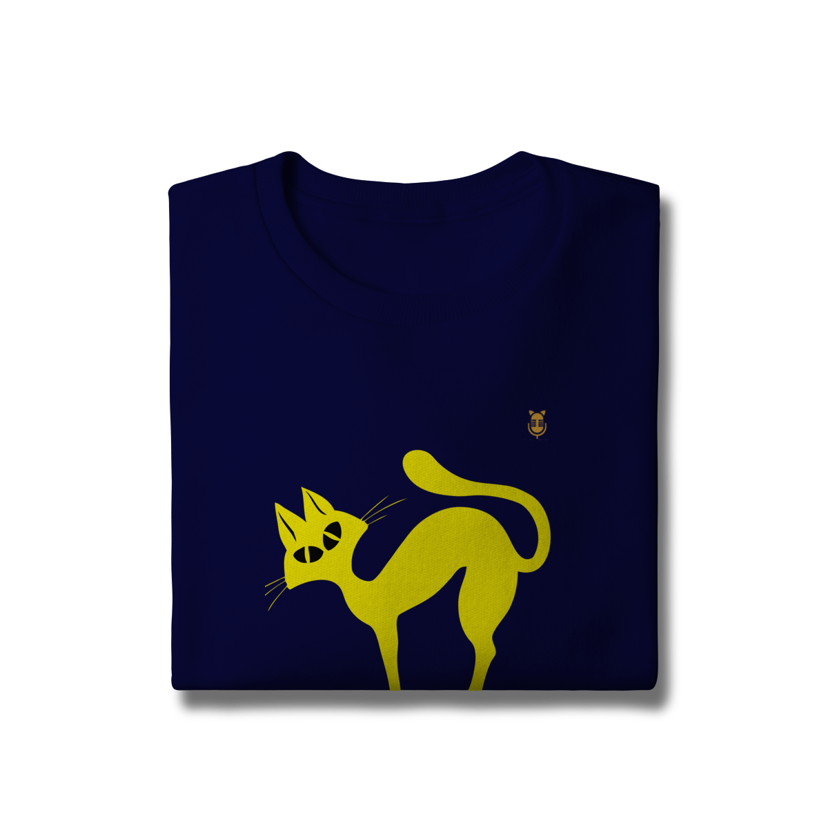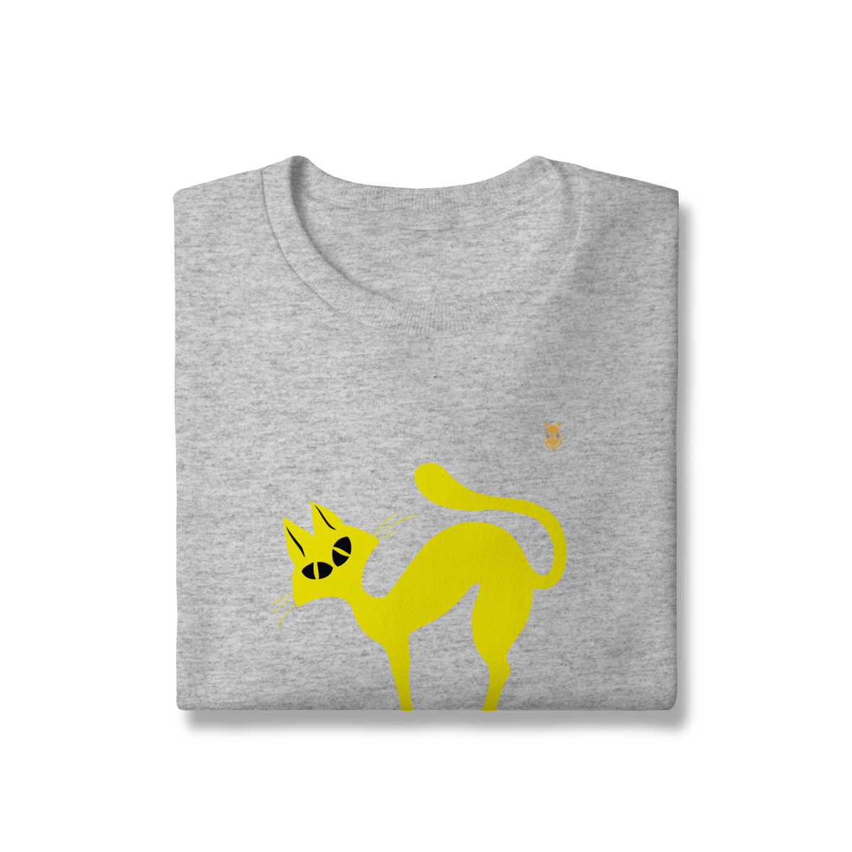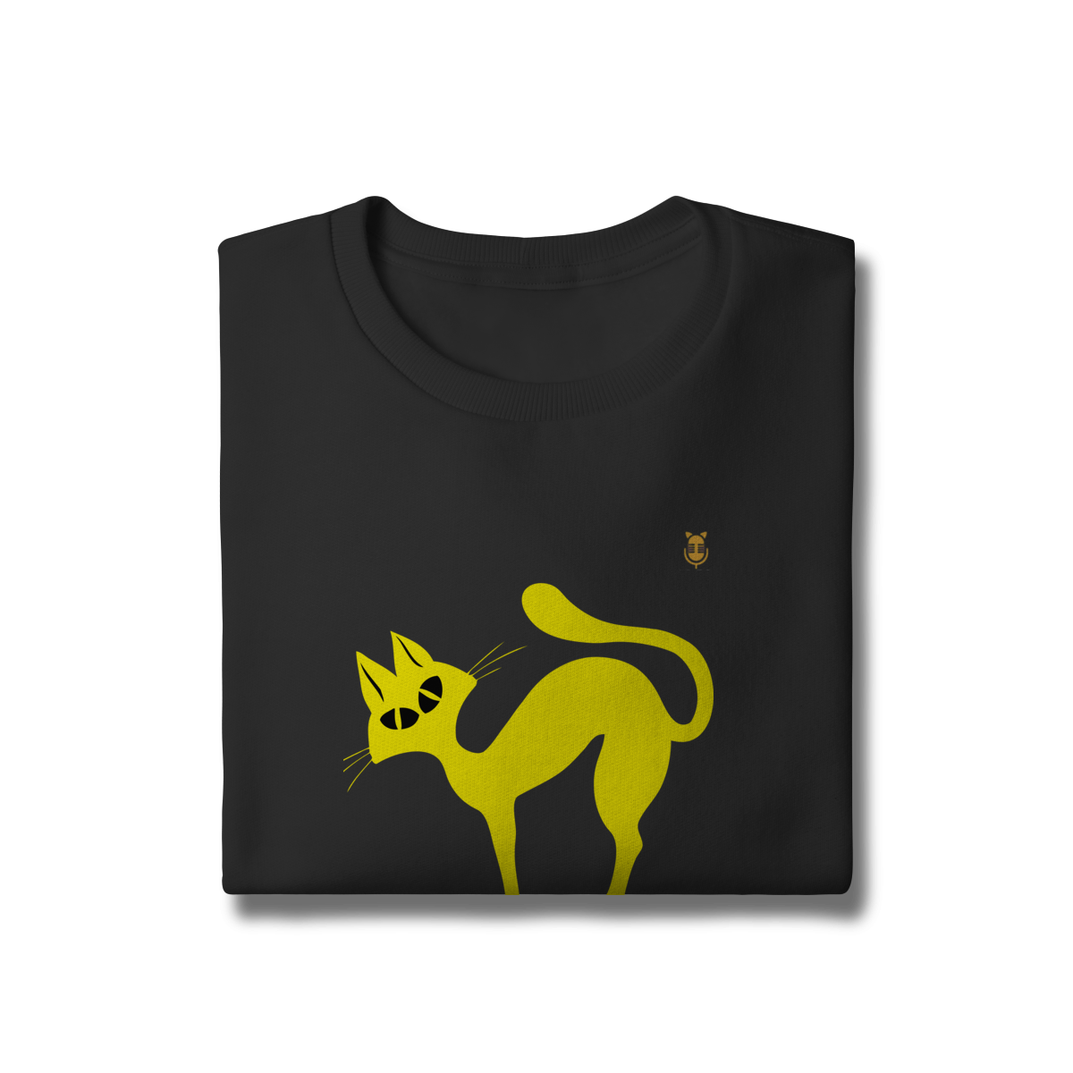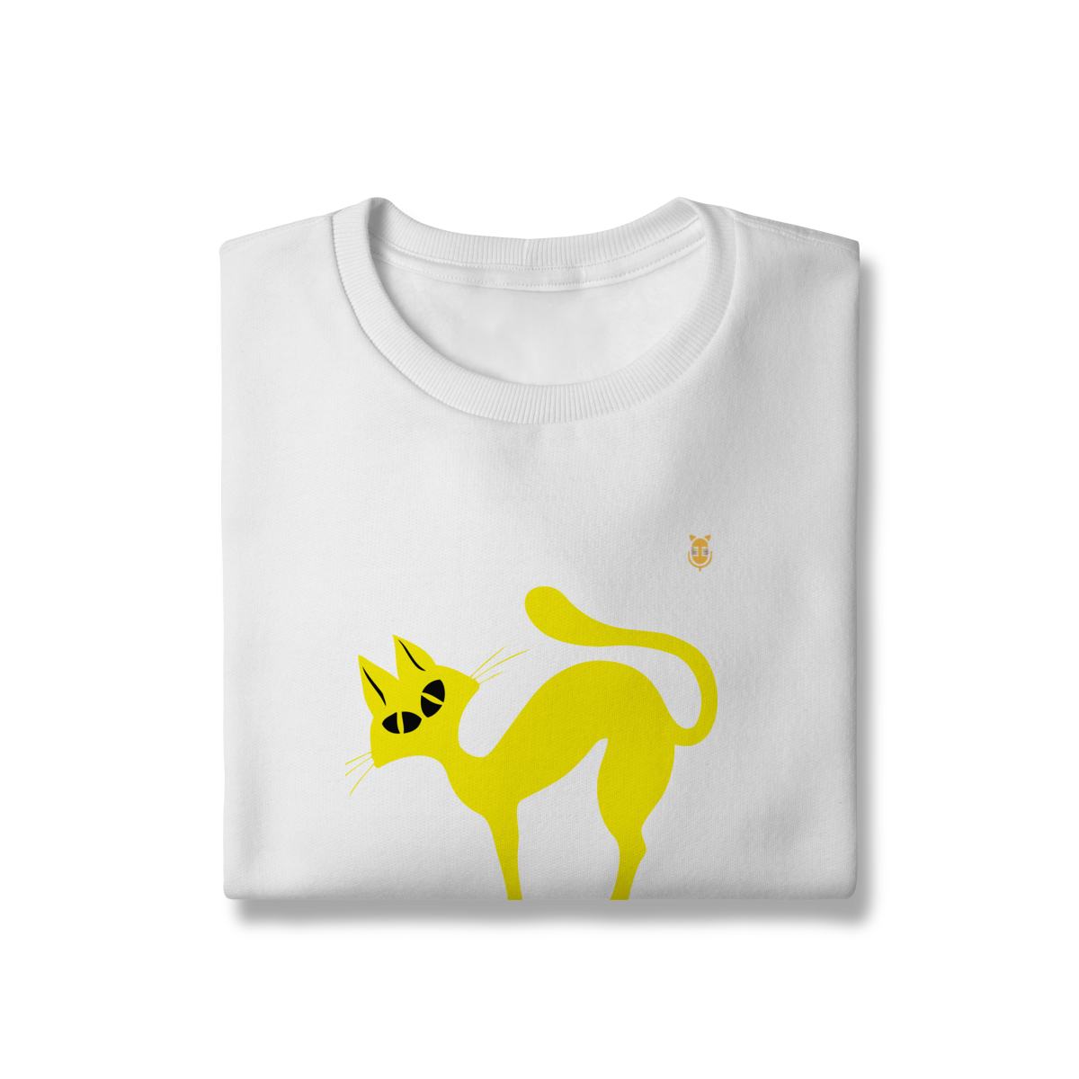 A  Gato Curioso traz um felino estilizado em linhas fluidas amarelas, com expressão intrigante e charme minimalista.