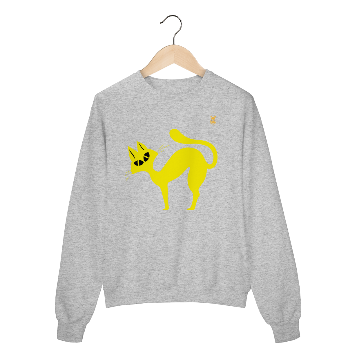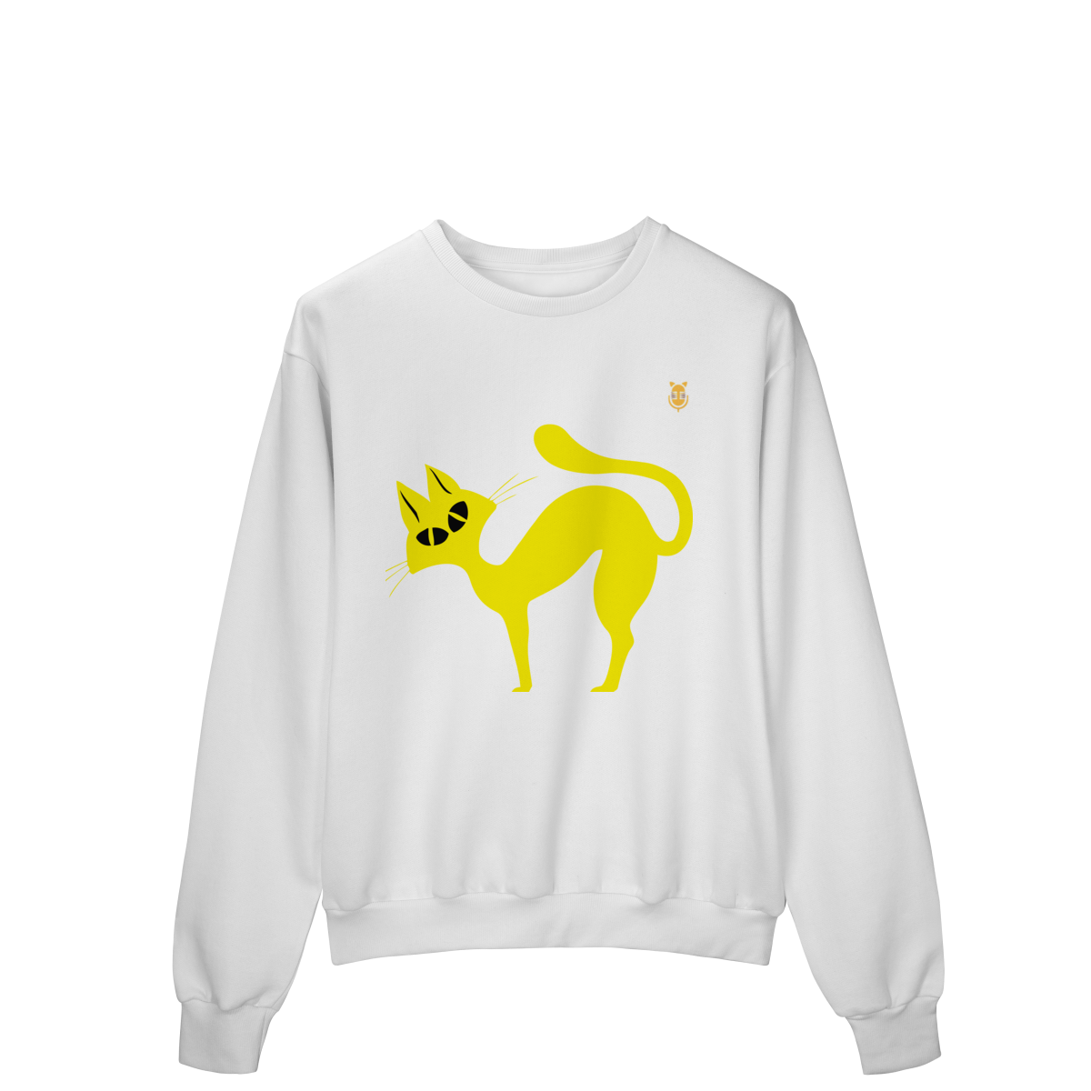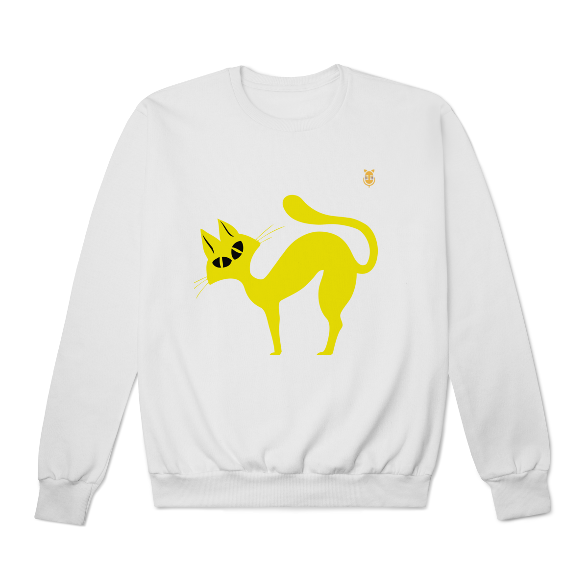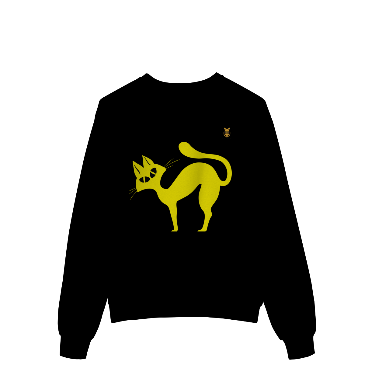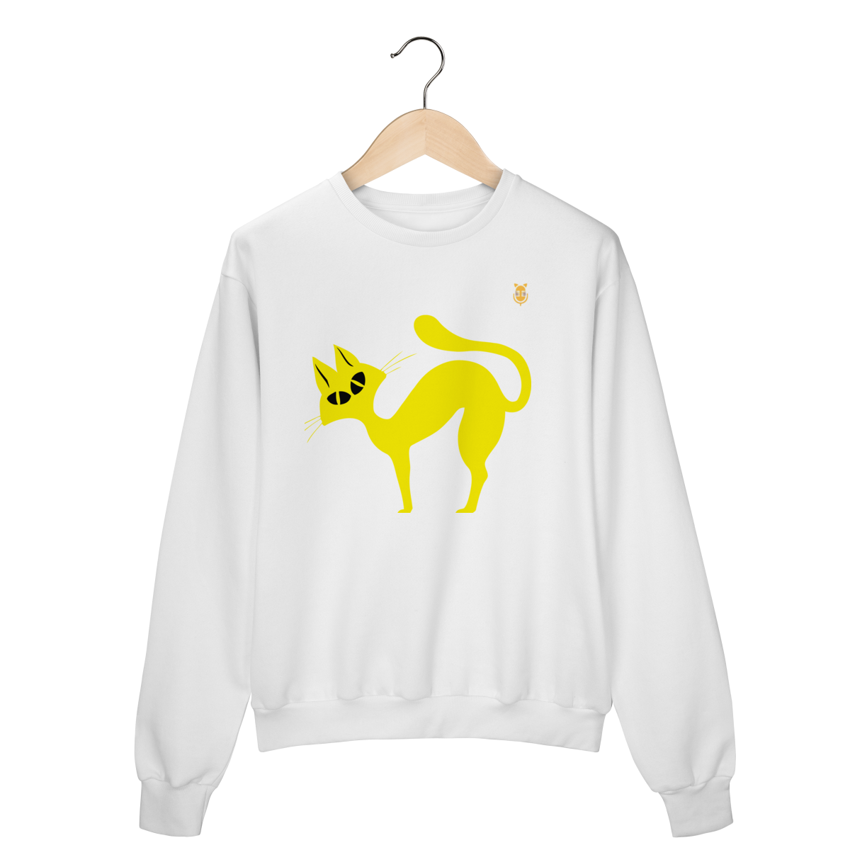 A  Gato Curioso traz um felino estilizado em linhas fluidas amarelas, com expressão intrigante e charme minimalista.