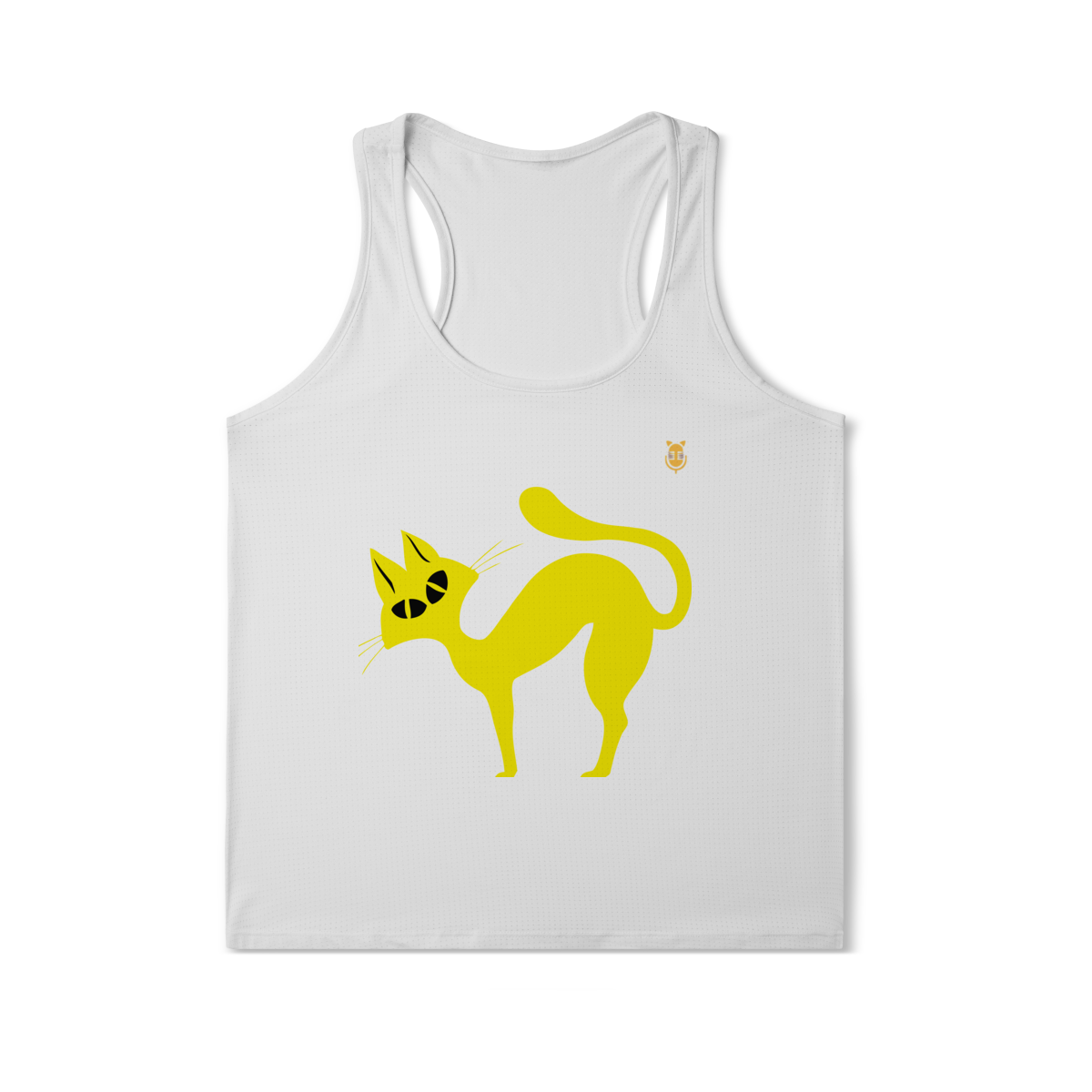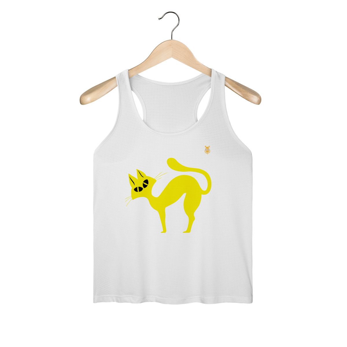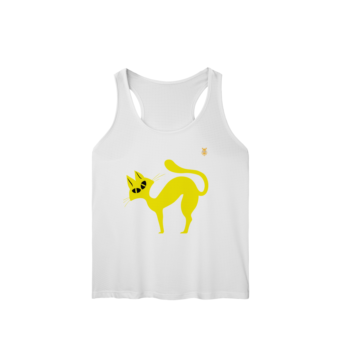 A  Gato Curioso traz um felino estilizado em linhas fluidas amarelas, com expressão intrigante e charme minimalista.