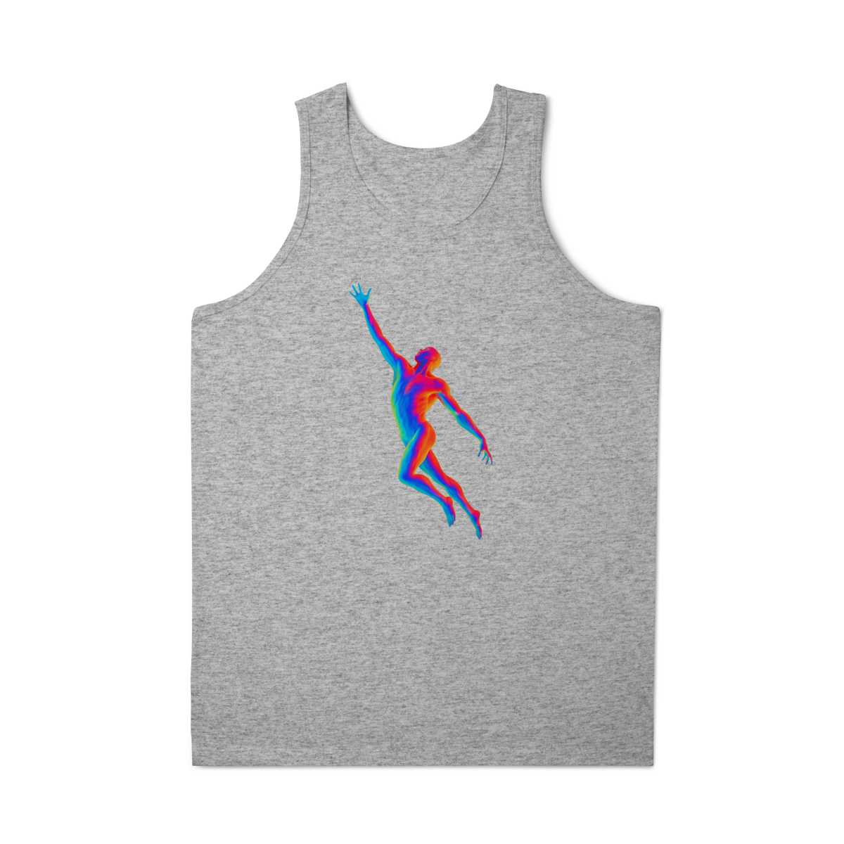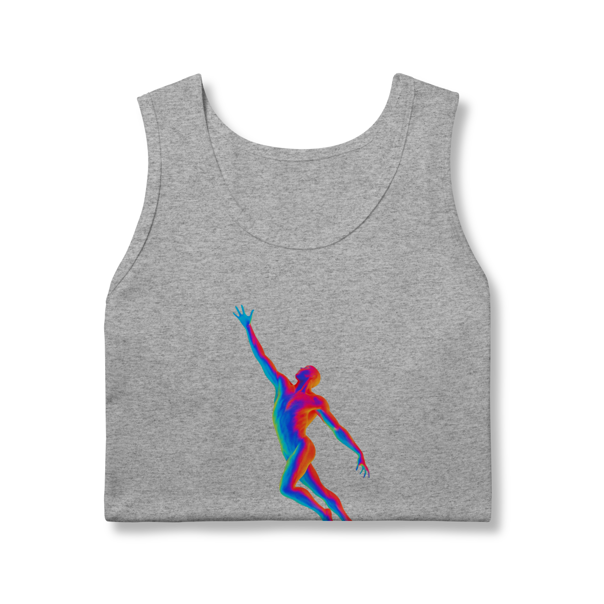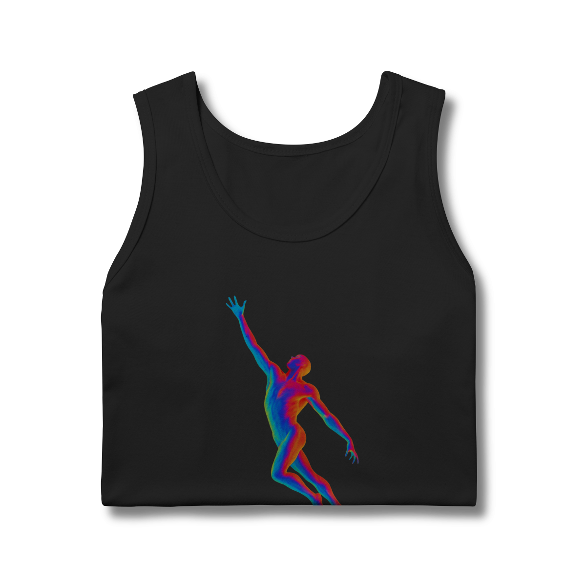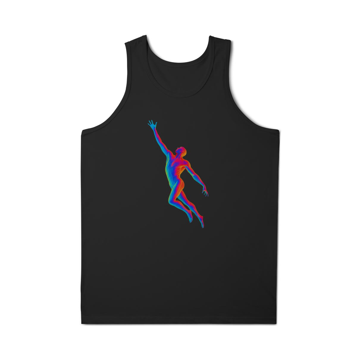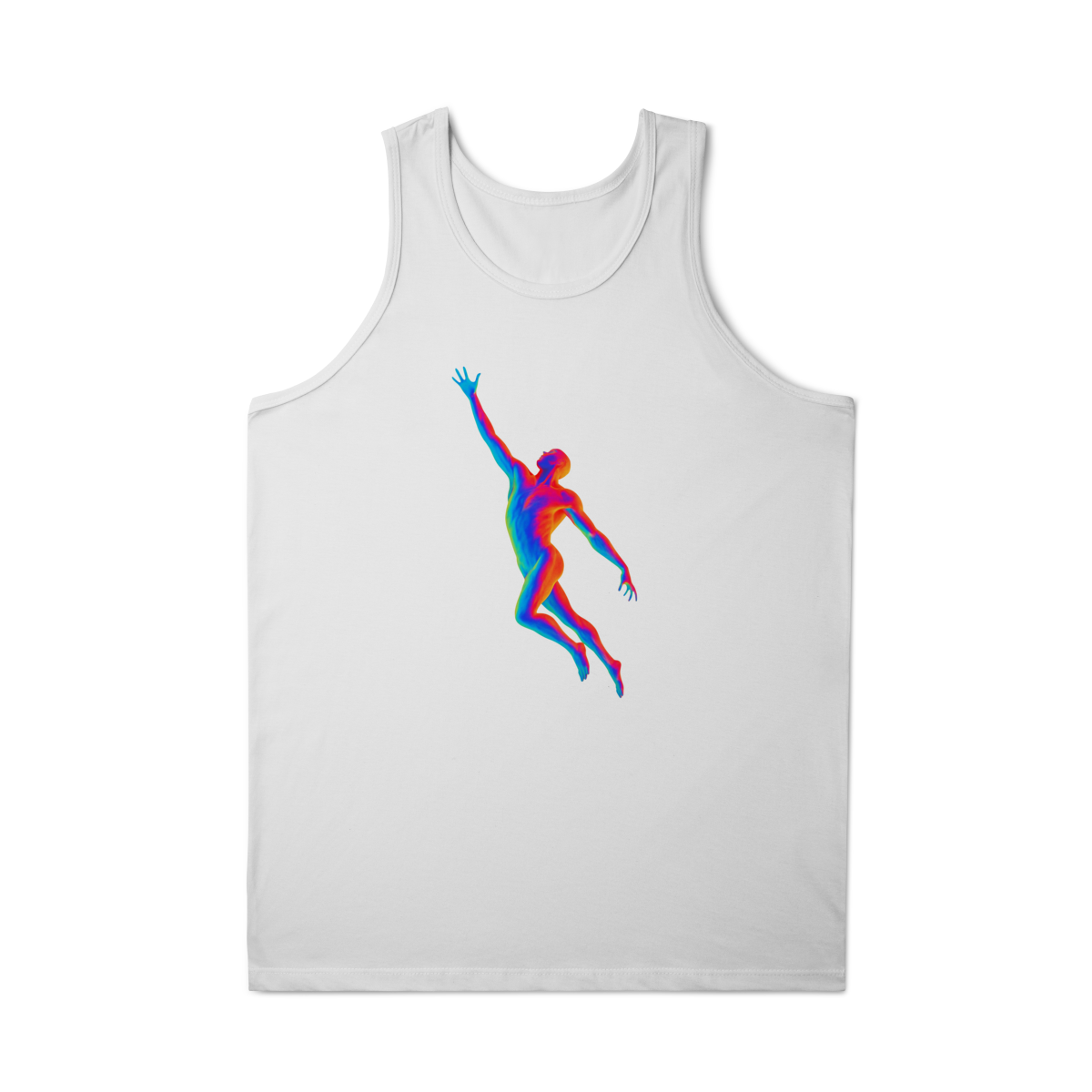 A Ascensão Psicodélica traz uma figura humana em posição de elevação, representada em cores vibrantes que criam um efeito térmico e surreal.