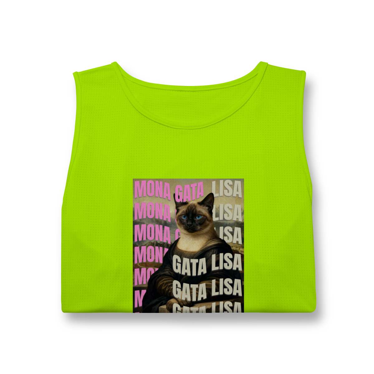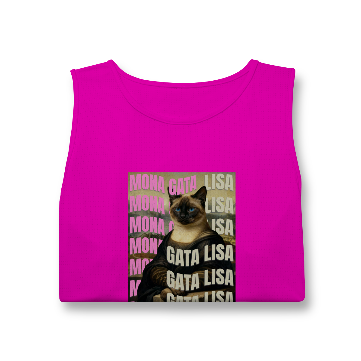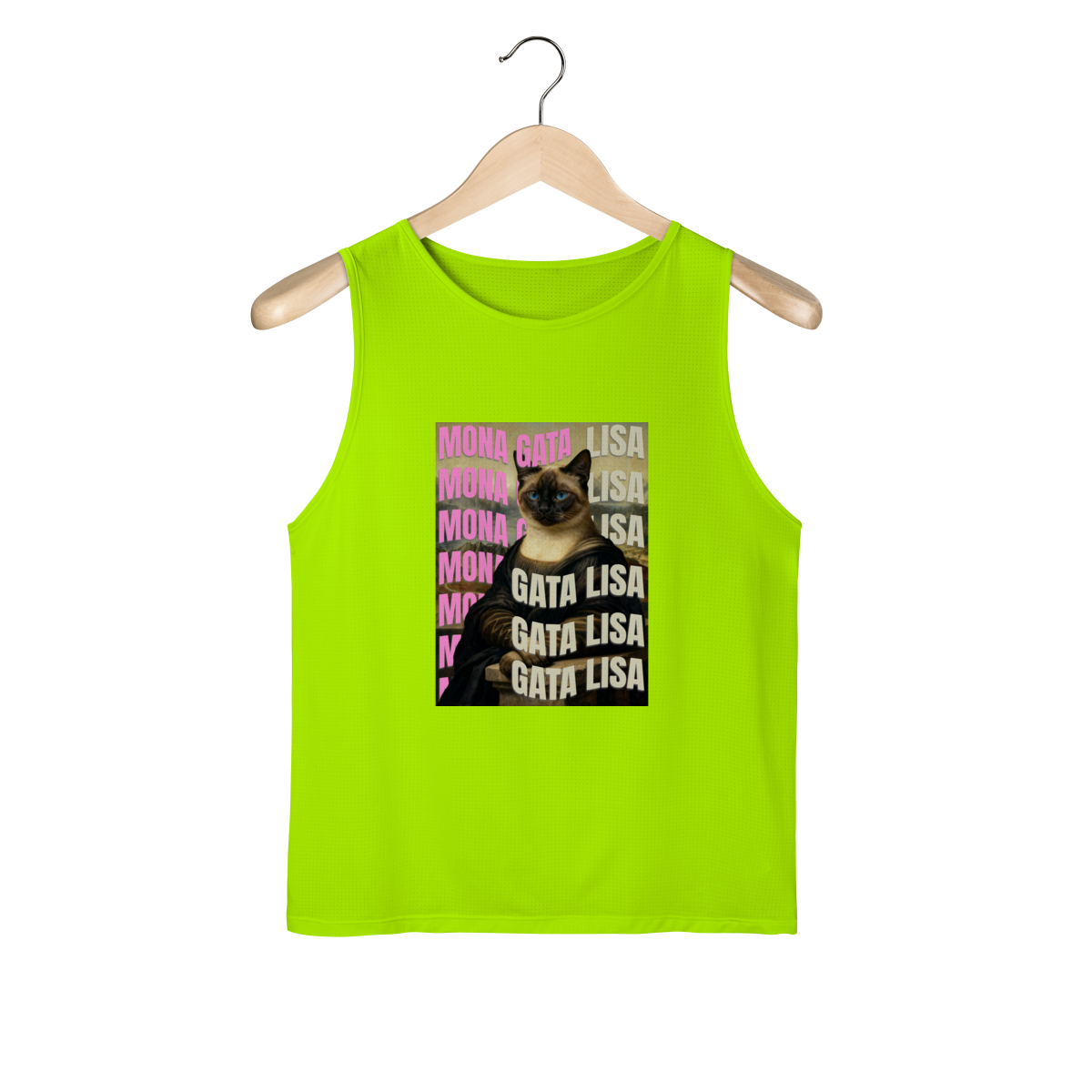 A Regata Gata Lisa traz uma paródia divertida da famosa obra “Mona Lisa”, mas reimaginada com uma gatinha siamesa. A estampa mistura humor e arte de um jeito simples e estiloso, perfeita para quem ama gatos e camisetas criativas. Confortável, moderna e com impressão de alta qualidade — ideal para usar no dia a dia ou presentear alguém especial.
